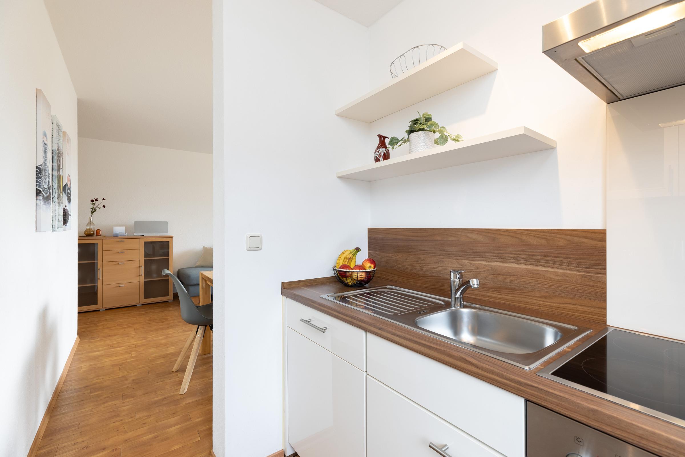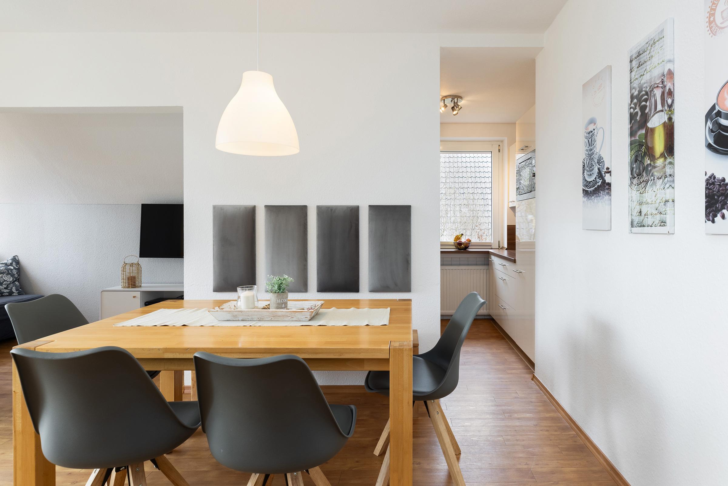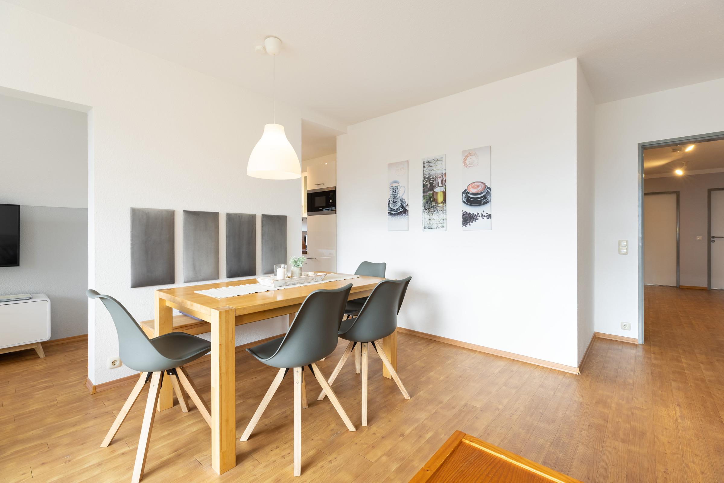 Erholen Sie sich in dieser 2024 neu gestalteten, modern möblierten Wohnung mit besonderem Ambiente. Der große Wohnraum bietet genügend Platz für eine Sitzgruppe (Sofa mit Ottomane und Hockerbank) und einen Esstisch mit Swing-Stühlen. Die angrenzende Küche ist mit elektrischem Komfort ausgestattet.