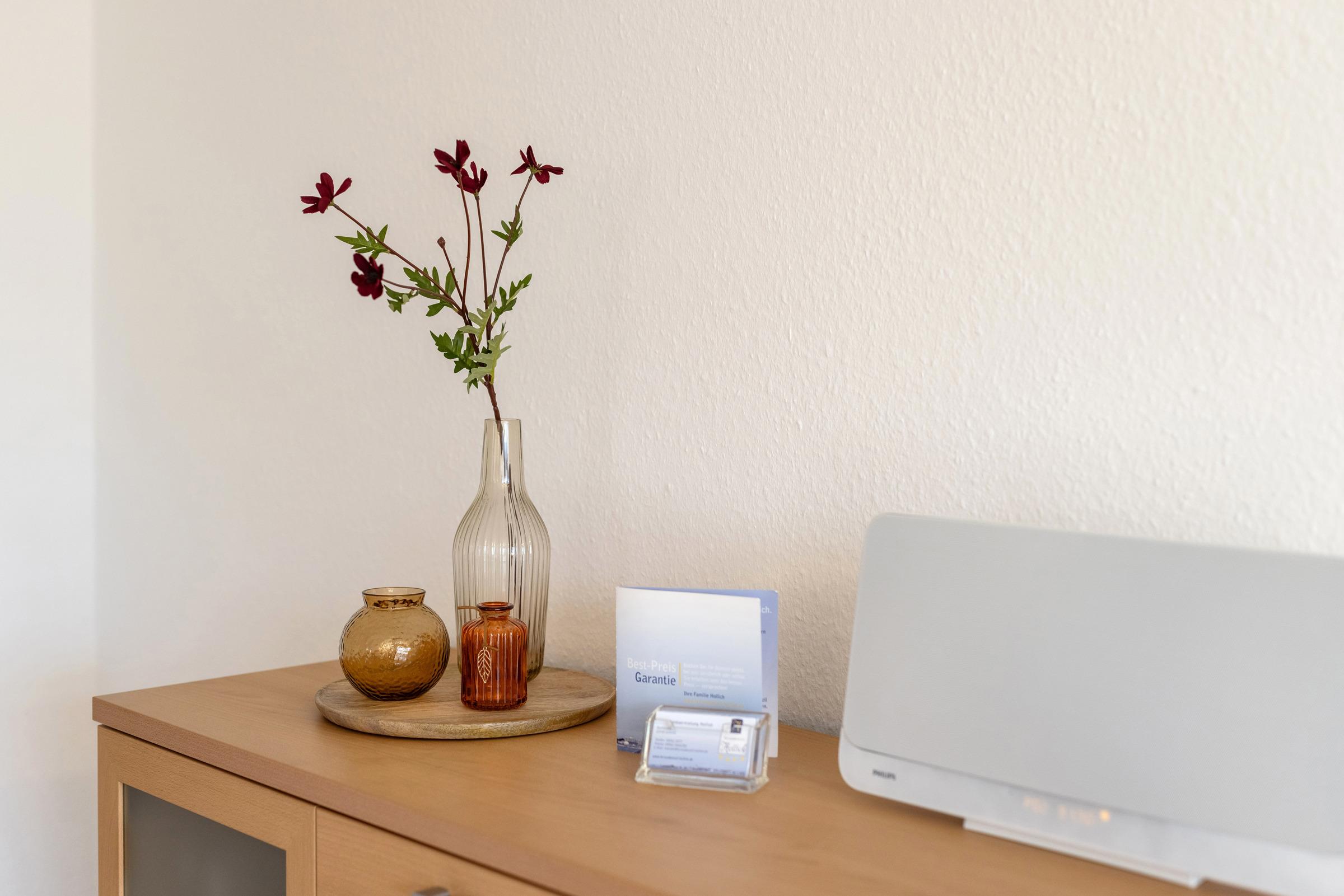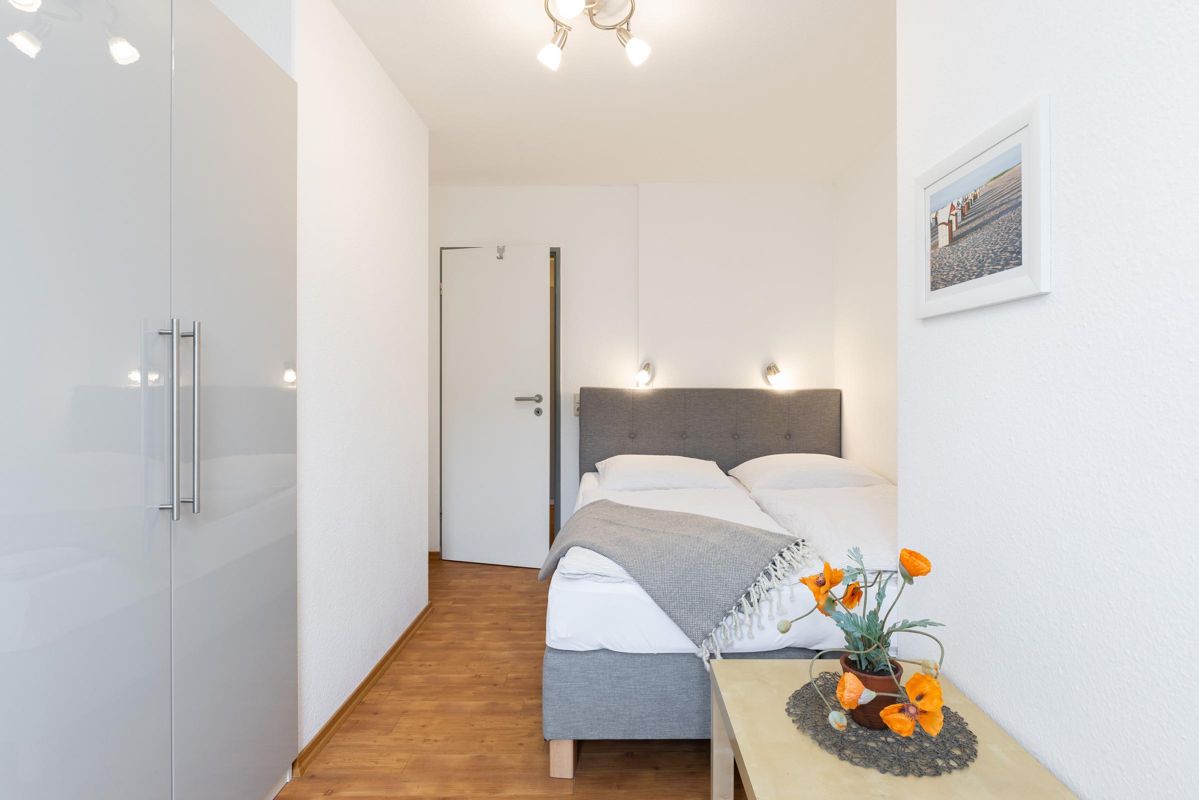Die drei Schlafräume sind ruhig zur Nordseite gelegen. Das Elternschlafzimmer ist mit einem Boxspringbett (je 90 x 200 cm) und 4-türigem Kleiderschrank eingerichtet. Der zweite Schlafraum hat ein Doppel-Boxspringbett (160 x 200 cm). Im dritten Zimmer sind zwei Boxspring-Einzelbetten (je 90 x 200 cm), jeweils mit einem Kleiderschrank von 100 cm.