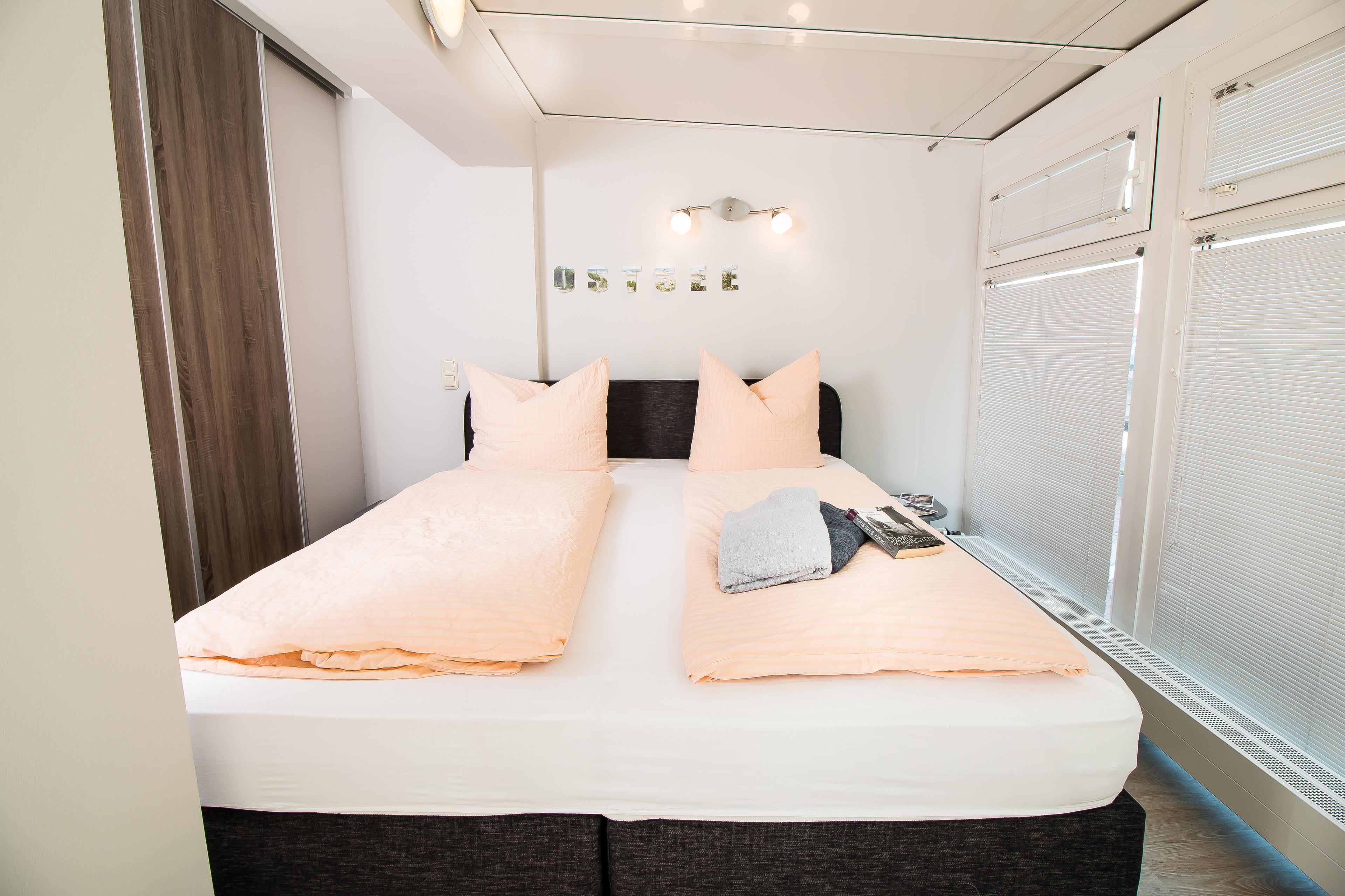 Schlaf- und Wohnbereich sind über ein modernes Schiebeelement von einander getrennt.