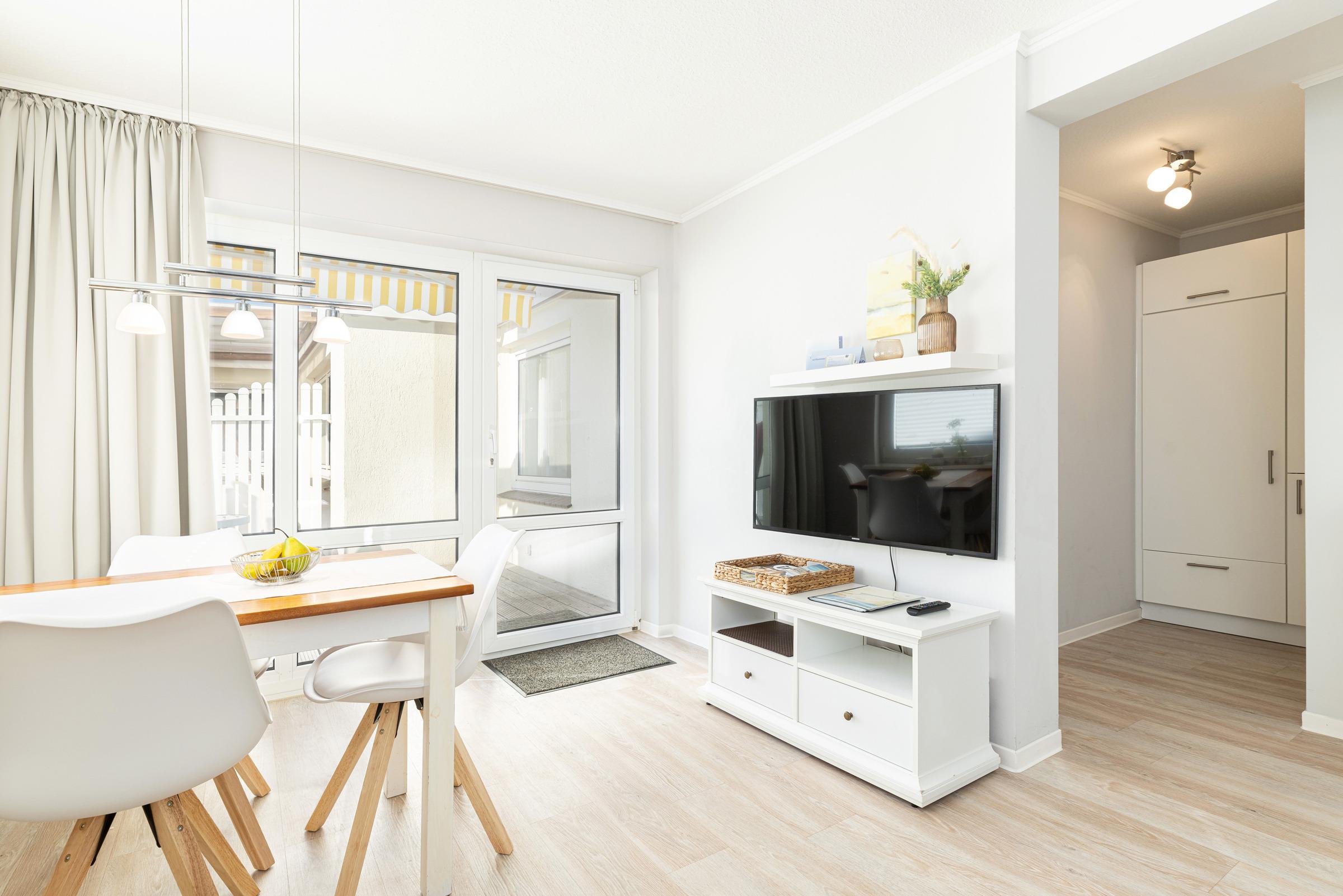Versteckt, hinter einem weißen Lamellenzaun, liegt die ca. 9 qm große Terrasse mit Holzboden und Markise, über die Sie das ruhig gelegene Apartment für 2-3 Personen erreichen.