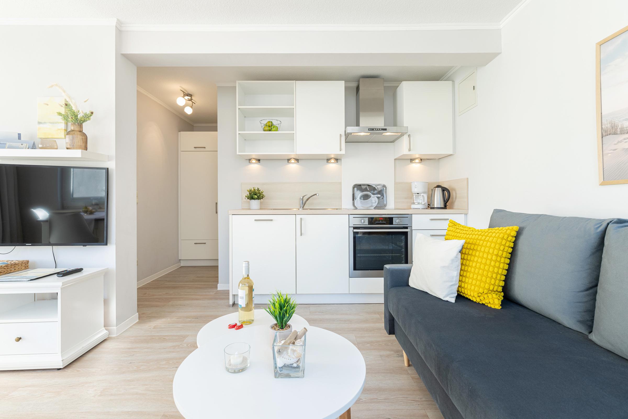 Hell und sonnig erscheint das moderne in 2025 neu eingerichtete Wohnzimmer mit Schlafsofa und Essplatz sowie Küchenzeile. Es wirkt frisch und hygienisch durch den hellen PVC-Designboden.
