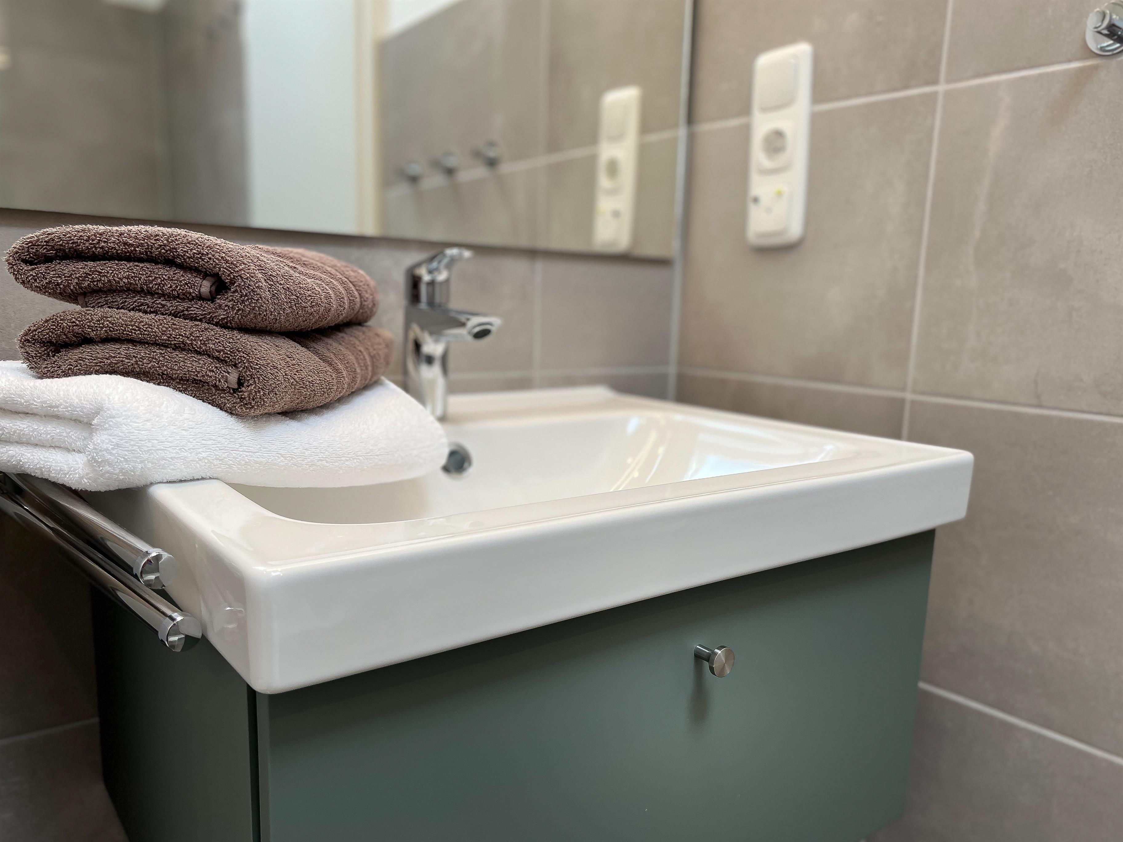 Durch das Carport kommen Sie über die Terrasse in den großen Wohnraum mit bodentiefen Fensterelementen. Viel Helligkeit und der hygienische, holzfarbene Designboden verleihen dem Apartment ein modernes Ambiente. Es erwarten Sie eine Sitzecke, (Schlafsofa + Hockerbank), Essplatz und Einbauküche.