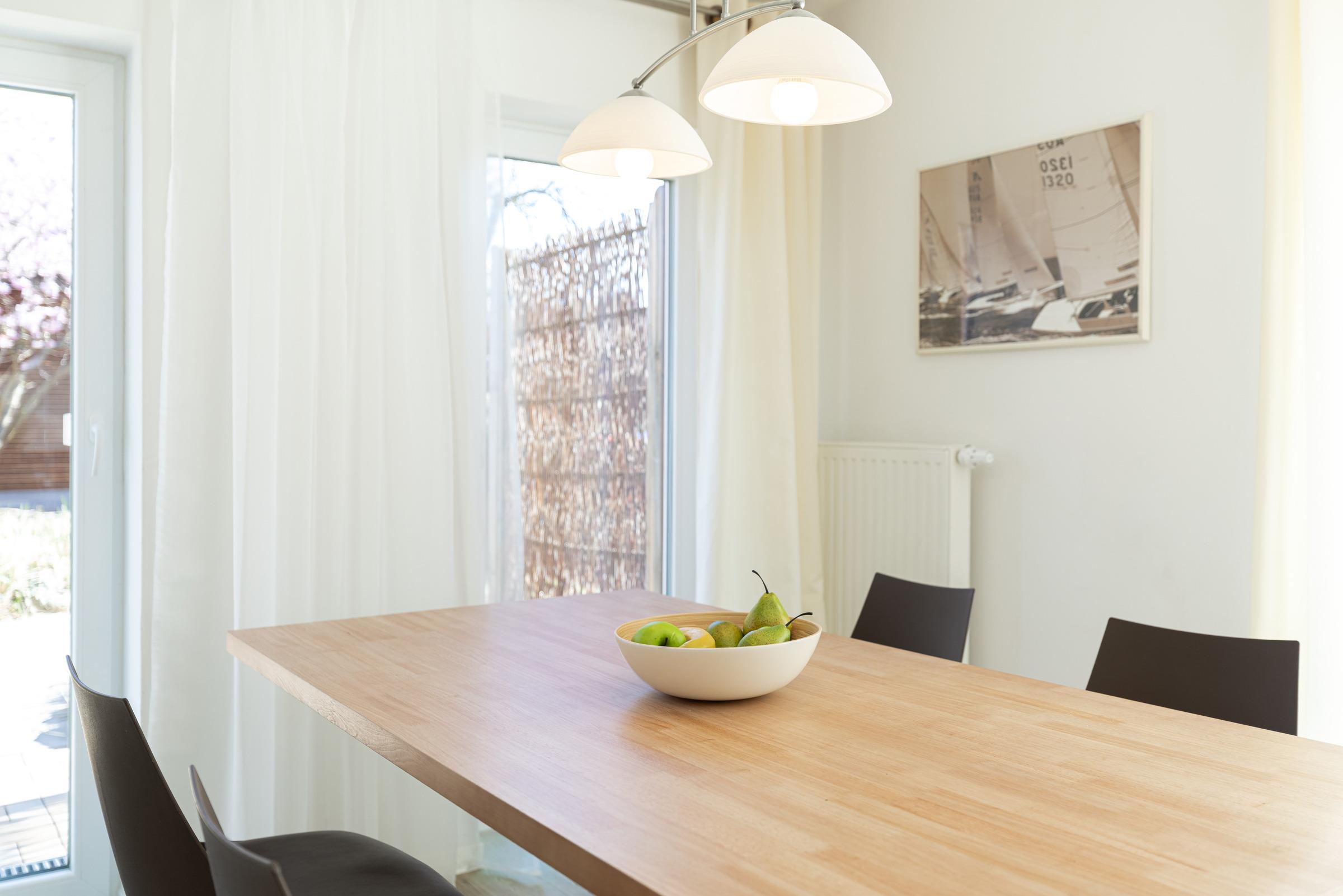 Am großen Design-Holzesstisch finden Sie in vier modernen Stühlen Platz. Gegenüber liegt die komfortabel ausgestattete Küchenzeile mit Geschirrspüler, 3-Sterne-Kühlschrank mit Gefrierfach und Herd mit Ceran-Kochfeld.