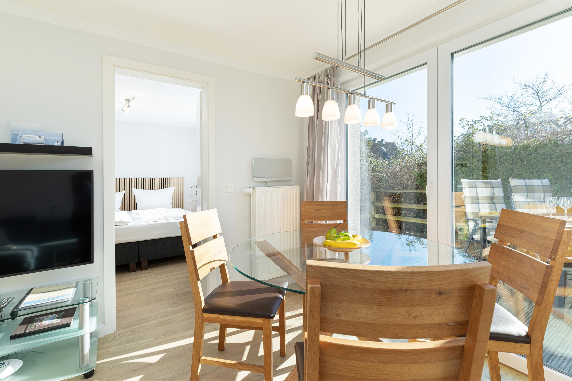 Kunststoff-Design-Fußboden in Sandfarbe und helle Wände zeugen von Sauberkeit und Hygiene. Die Viermeter-Fensterfront zur Süd-Westseite versorgt den großzügigen Wohnraum mit viel Licht und garantiert freundliche Helligkeit. Direkt davor finden Sie die moderne Esstischgruppe mit wertigen Massivholz-Stühlen.