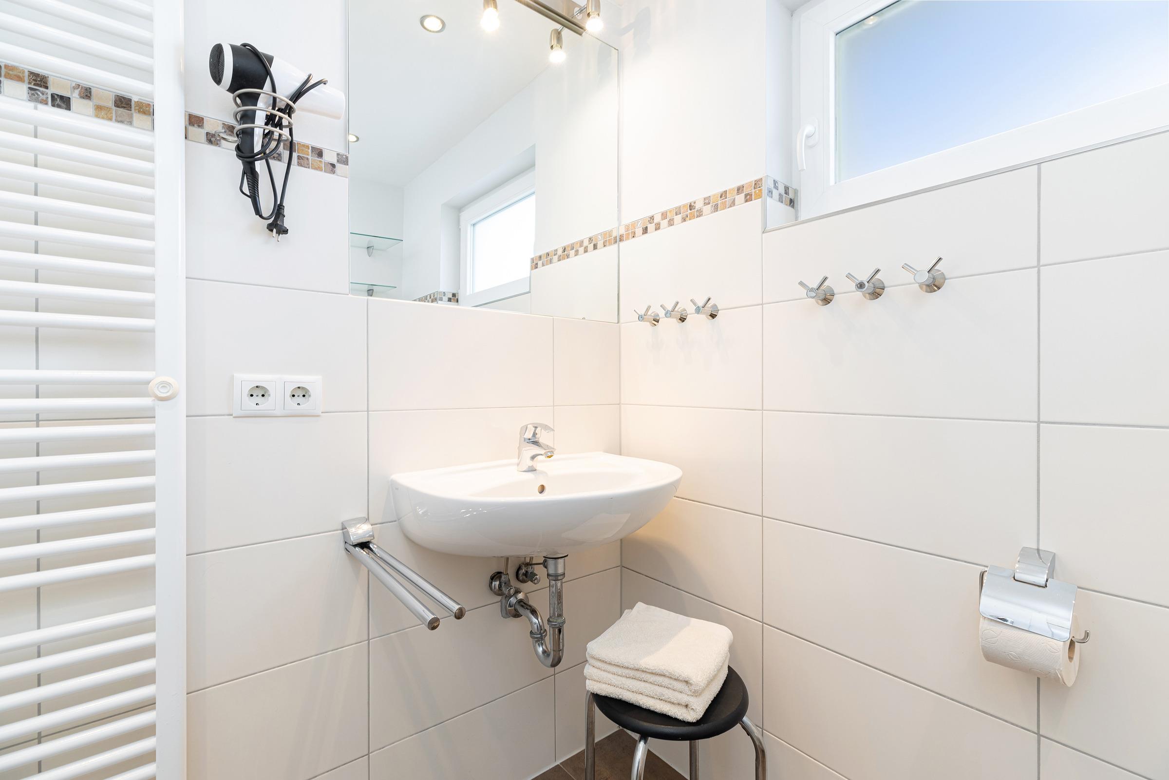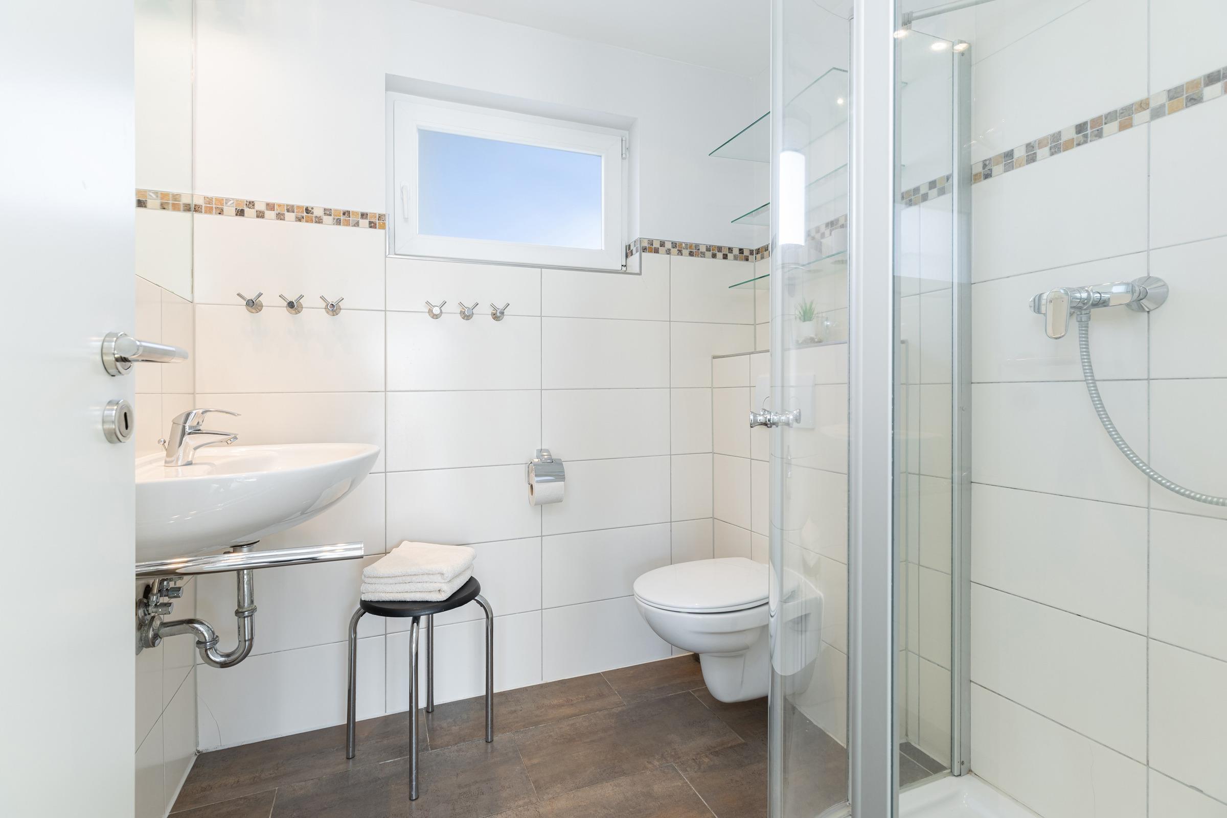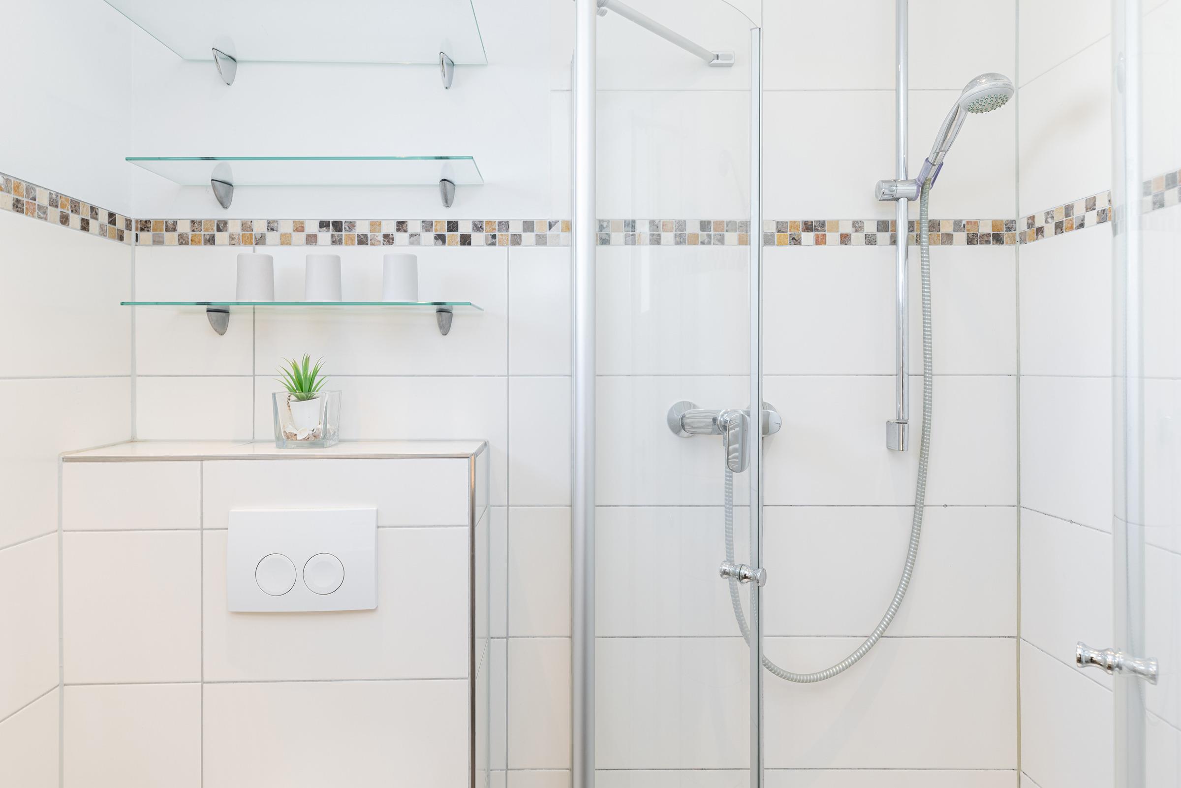 Das Bad wirkt warm und klar durch harmonische Farben und die gläserne Duschtrennwand. Moderne Objekte und große Fliesen unterstreichen den angenehmen Gesamteindruck des Raumes.
