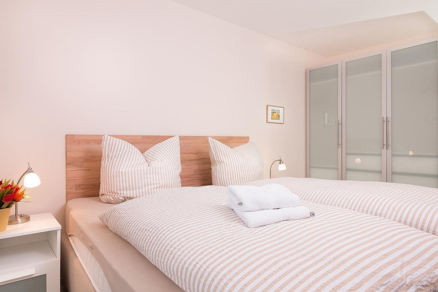 Ein kleiner Flur führt aus dem Wohnbereich heraus zum Duschbad mit WC, Abstellraum und zu den Schlafräumen. Das erste Schlafzimmer ist mit Doppelbett (2 x 90 x 200 cm) und Kleiderschrank eingerichtet. Zum zweiten Schlafraum mit Boxspringbett (2 x 90 x 200 cm) und geräumigem Schrank gelangen Sie über eine Stufe.