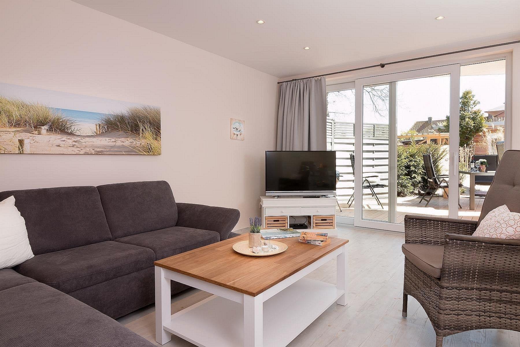 Über die Terrasse kommen Sie in Ihr Urlaubs-Quartier. Der große Wohnraum mit komfortabler Küche, Esstisch und Stühlen lädt direkt zum Wohlfühlen ein. Das modische Ecksofa hat eine Ottomane ist ausziehbar (Bettfunktion). Von hier aus genießen Sie ganz bequem den Blick in den Garten mit Strandkorb oder zum Fernseher.