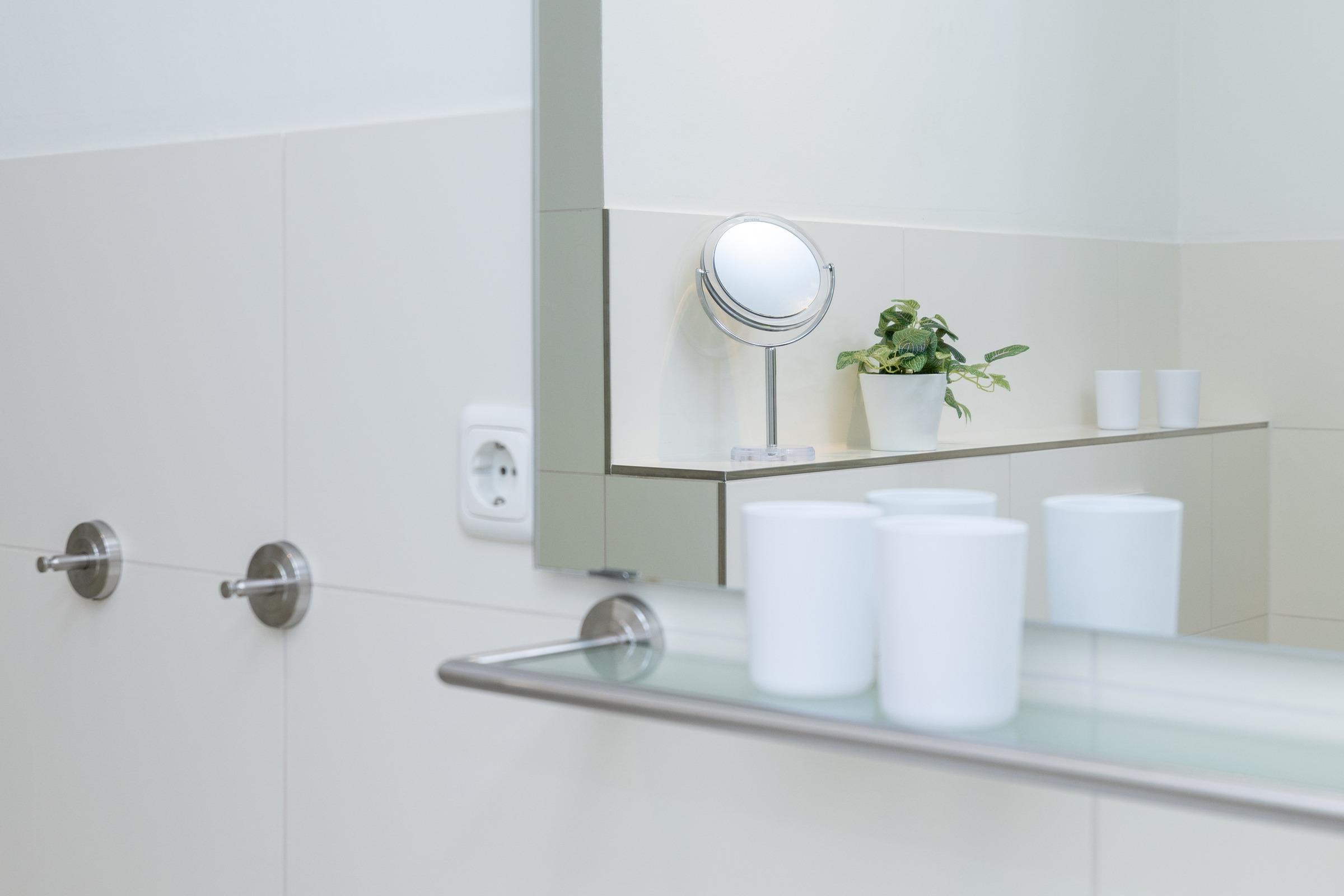 Das Schrankelement im großen Flurraum bietet genügend Stauraum. Von hier aus gehen Sie in zwei Schlafräume mit je 2 Betten - einmal 90 x 200 cm (Boxspring) und einmal 80 x 200 cm. Das Bad ist sandfarben gefliest und weiße Objekte mit Accessoires, Handtuch-Heizkörper sowie Echtglasdusche verleihen dem Raum Moderne.