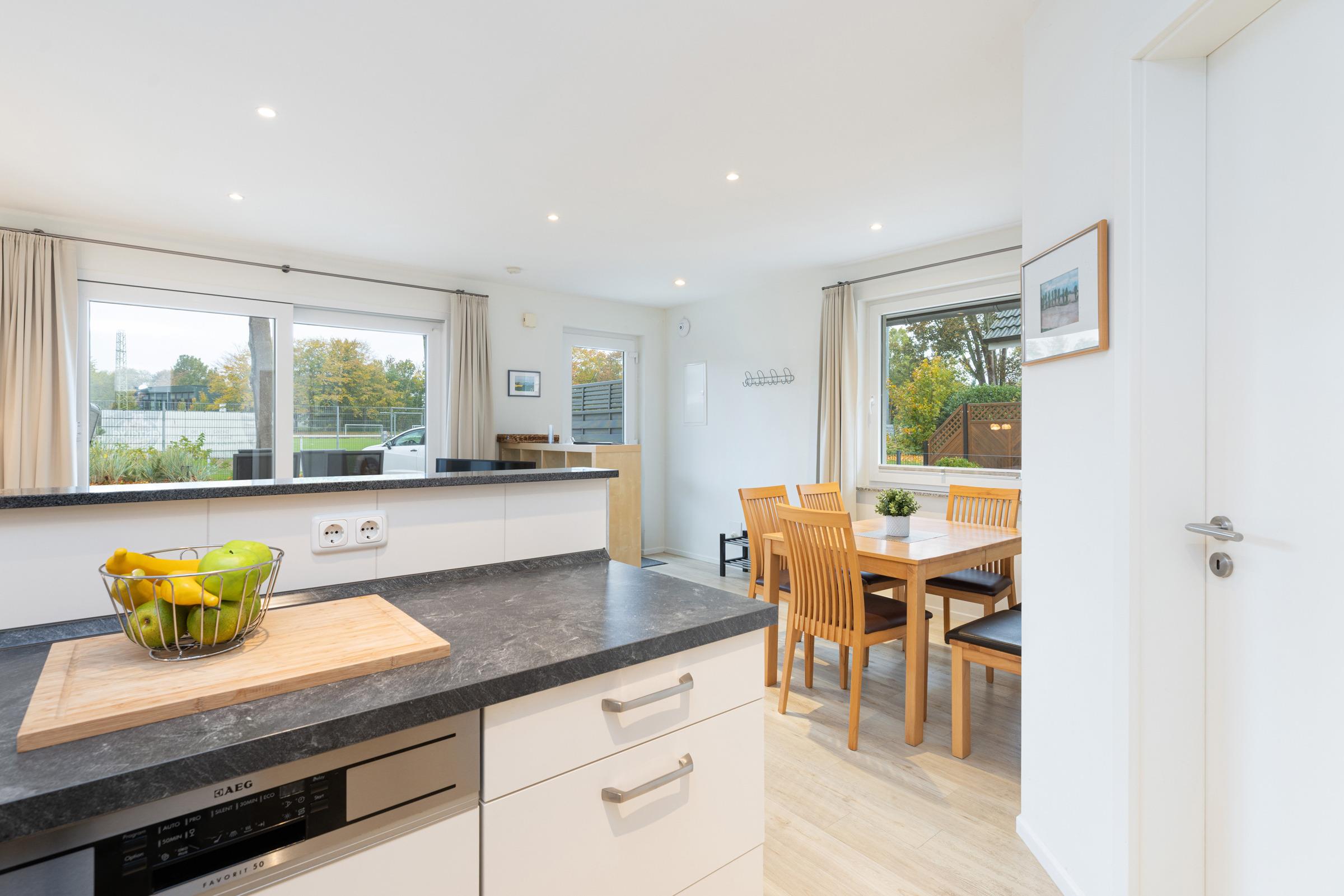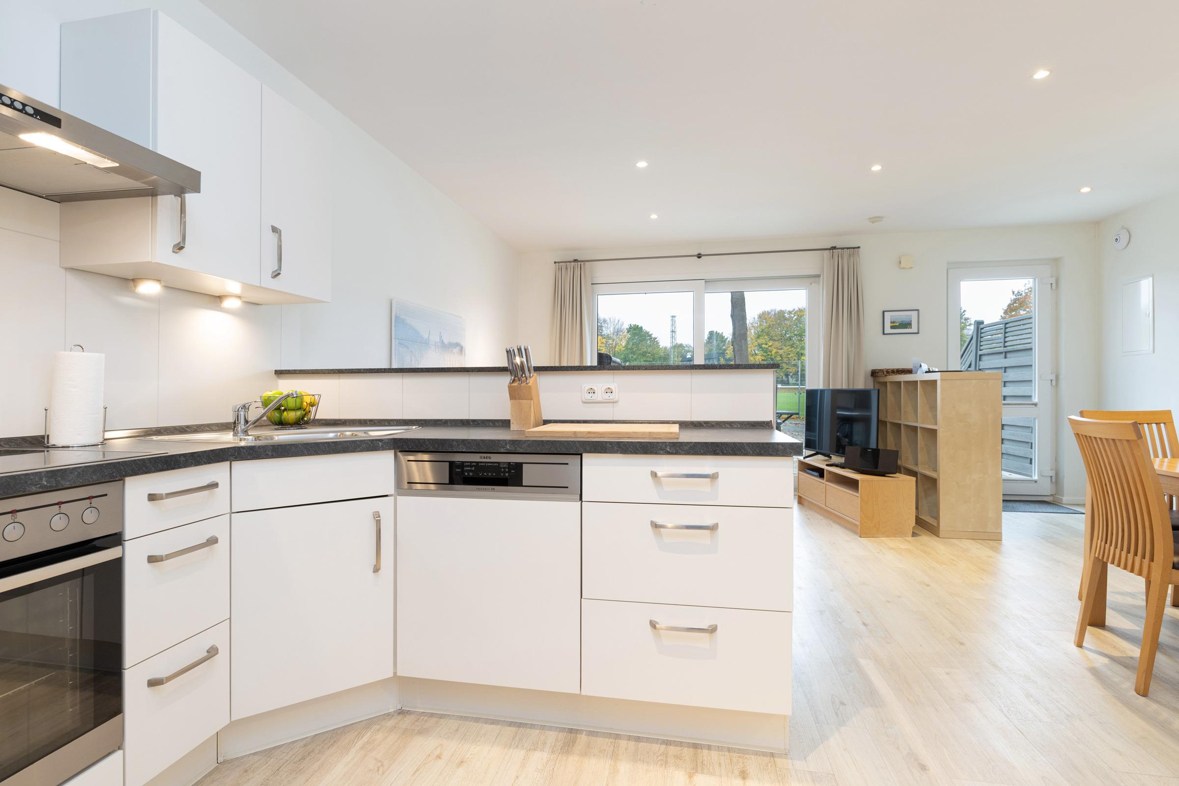 Treten Sie ein in Ihr Apartment und spüren Sie sofort Urlaubsfreude. Ihr Blick fällt direkt auf die offene Winkelküche mit modernsten Elektrogeräten auch für gehobene Qualitätsansprüche. Die Naturholz-Esstisch-Gruppe mit Bank und Stühlen wirkt warm und einladend. Von der Sofaecke mit Schlaffunktion genießen Sie den Blick ins Grüne. Flachbild-TV und Regal bieten eine harmonische Raumtrennung.