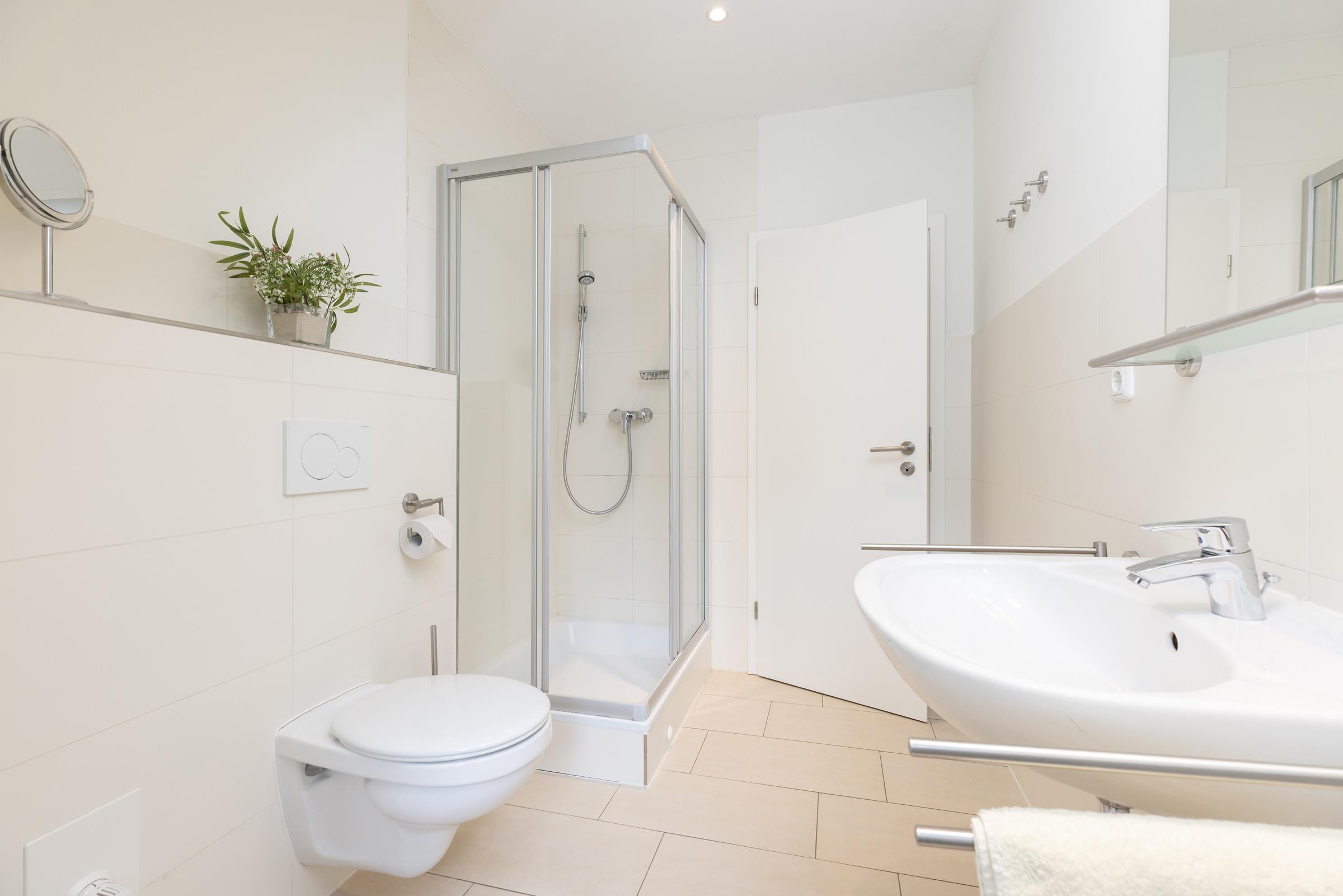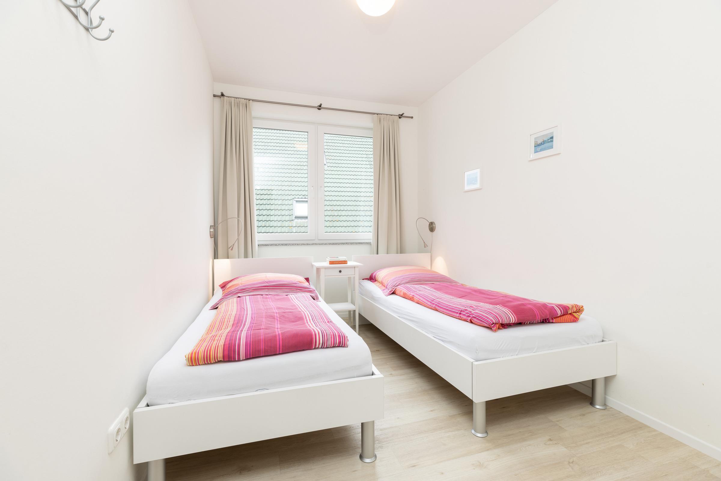 Vom Flurbereich mit großem Schrank gelangen Sie in beide Schlafzimmer oder ins Bad. Ein Schlafraum ist eingerichtet mit Doppelbett je 90 x 200 cm + Schrank und der zweite mit je einem Bett von 90 x 200 cm. Das Bad mit Tageslicht wirkt groß und Echtglasdusche, weiße Objekte mit Accessoires und Handtuch-Heizkörper unterstreichen den modernen Komfort-Charakter.