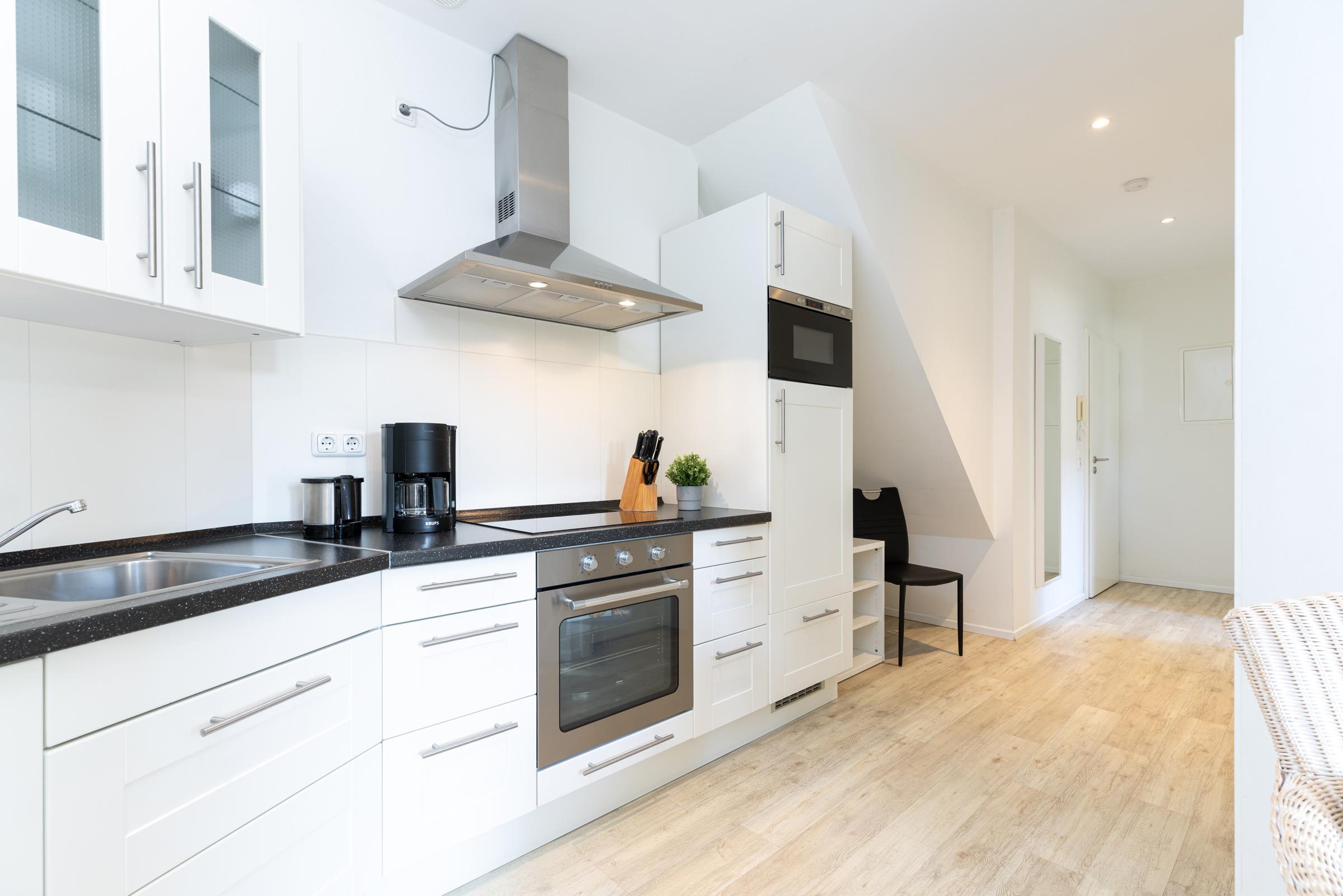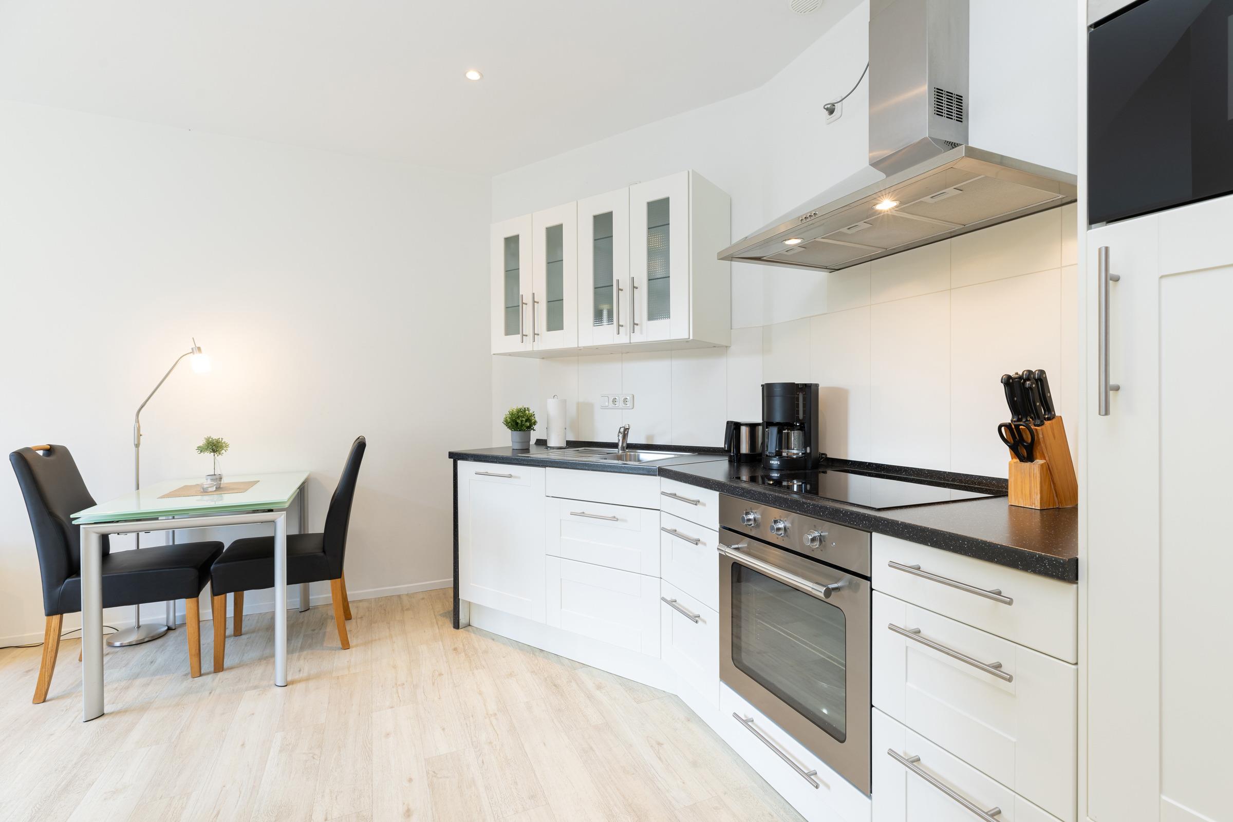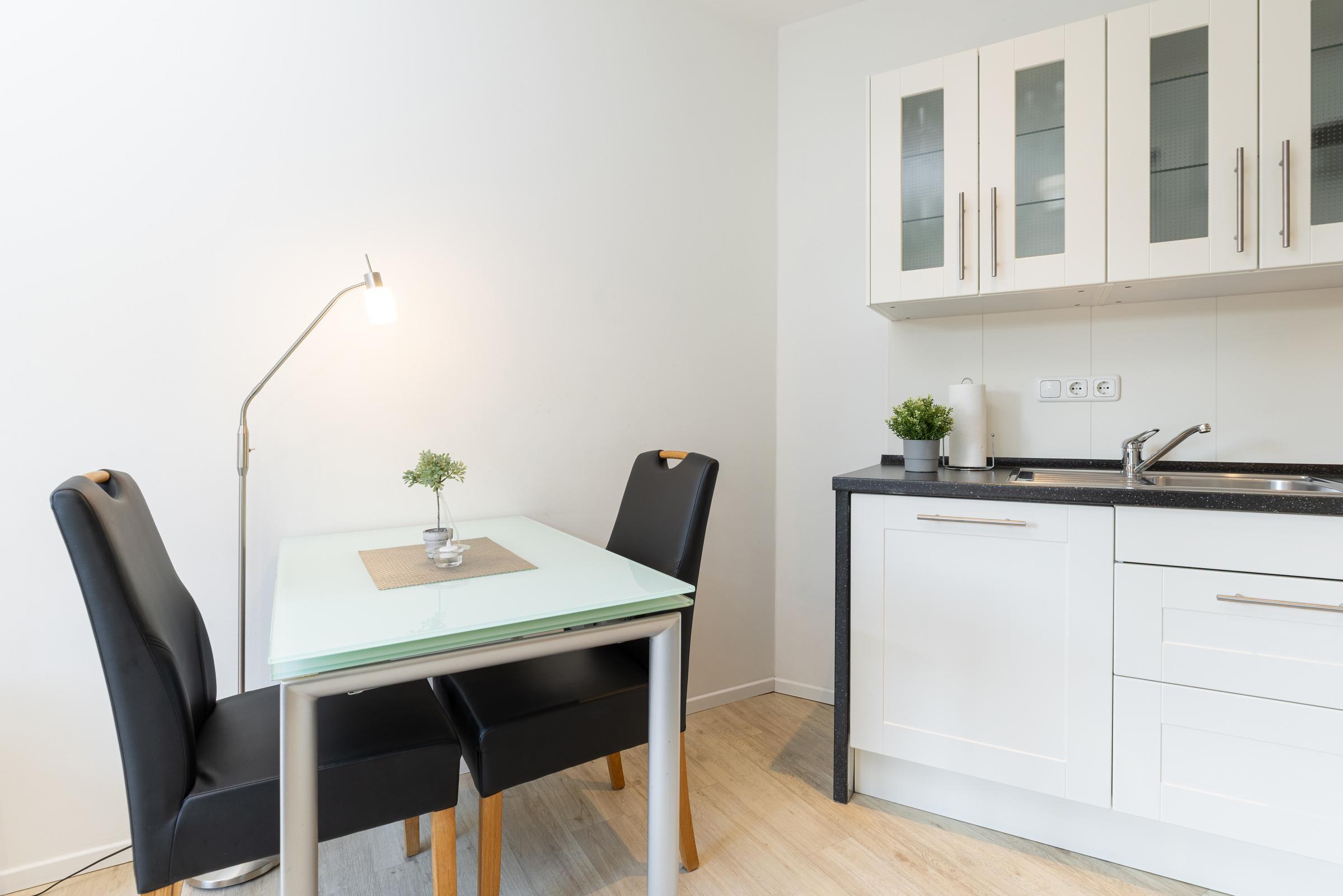 Helligkeit durch bodentiefe Fenster und moderner zeitloser Charme begeistern beim Eintritt in dieses Apartment. Gediegene architektonische Anordnung weckt Interesse und verleiht der Wohnung einzigartigen Charakter. Dem Wohnraum in Winkelform ist eine hübsche Küchenzeile angepasst. Diese ist hochwertig und mit allen modernen Elektrogeräten ausgestattet. Daran schließt sich der ausziehbare Glas-Esstisch mit Lederstühlen an. Das Sofa zum Entspannen hat Schlaffunktion und steht am Fensterelement mit kleinem Frühstücks- Balkon. Von hier aus ist ein Blick ins Grüne möglich. Sessel und Flachbild-TV gehören zur Ausstattung.