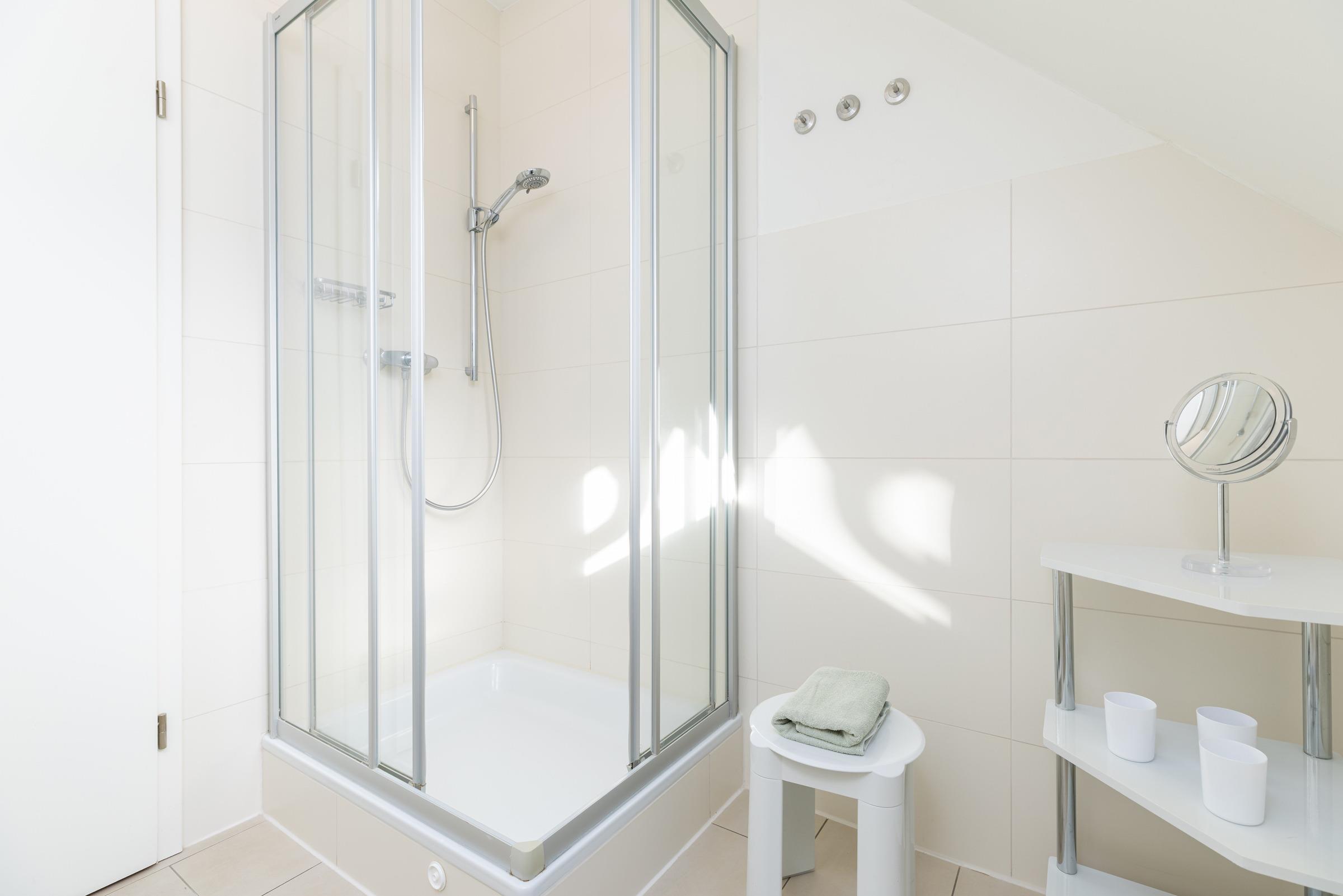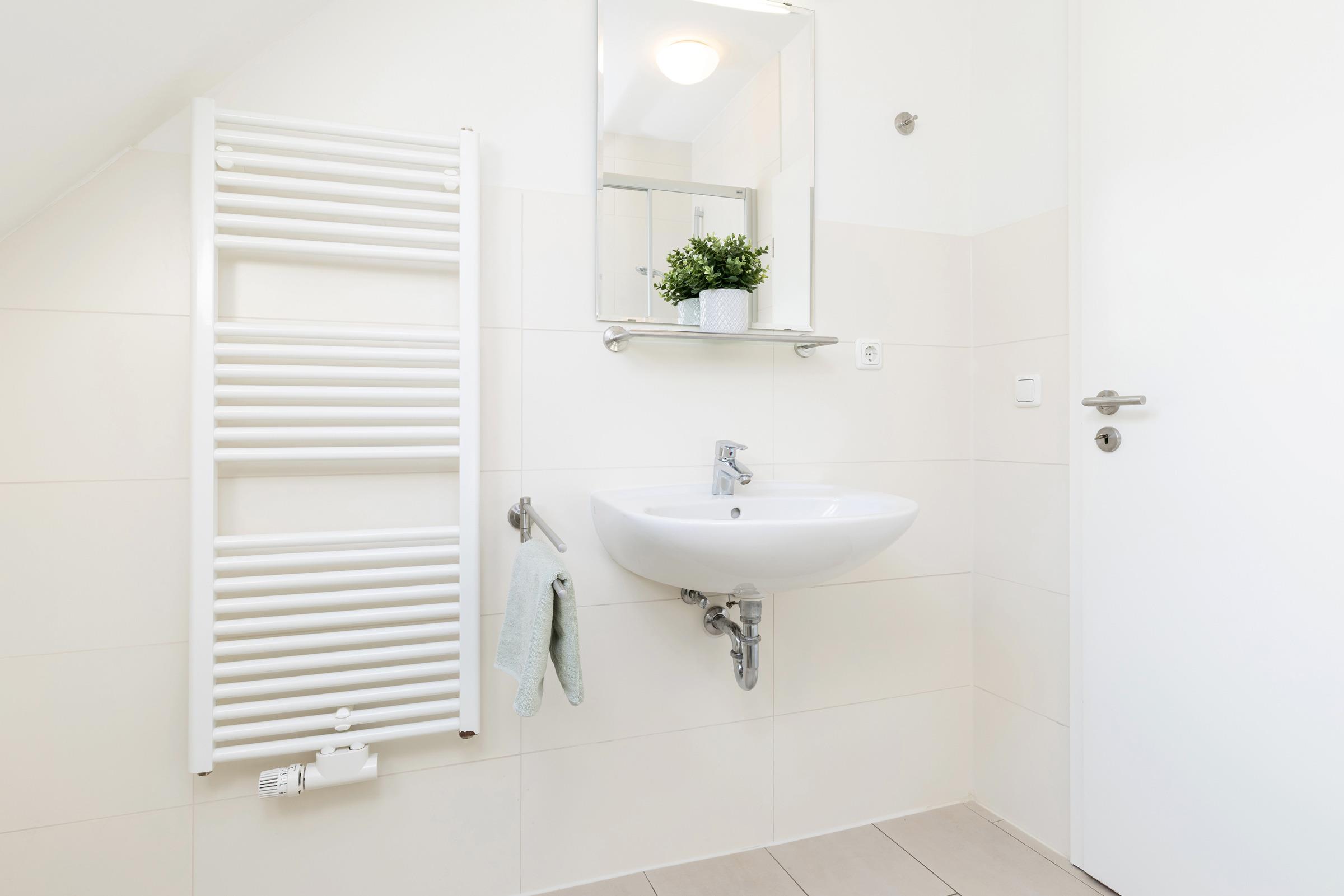 Das Schlafzimmer hat ein Doppelbett mit je 90 x 200 cm + Kleider-Schiebeschrank. Das Bad ist hell gefliest und lässt viel Morgensonne durch das Dachfenster. Echtglasdusche und weiße Objekte mit Handtuch-Heizkörper sowie schöne Accessoires wirken einladend.