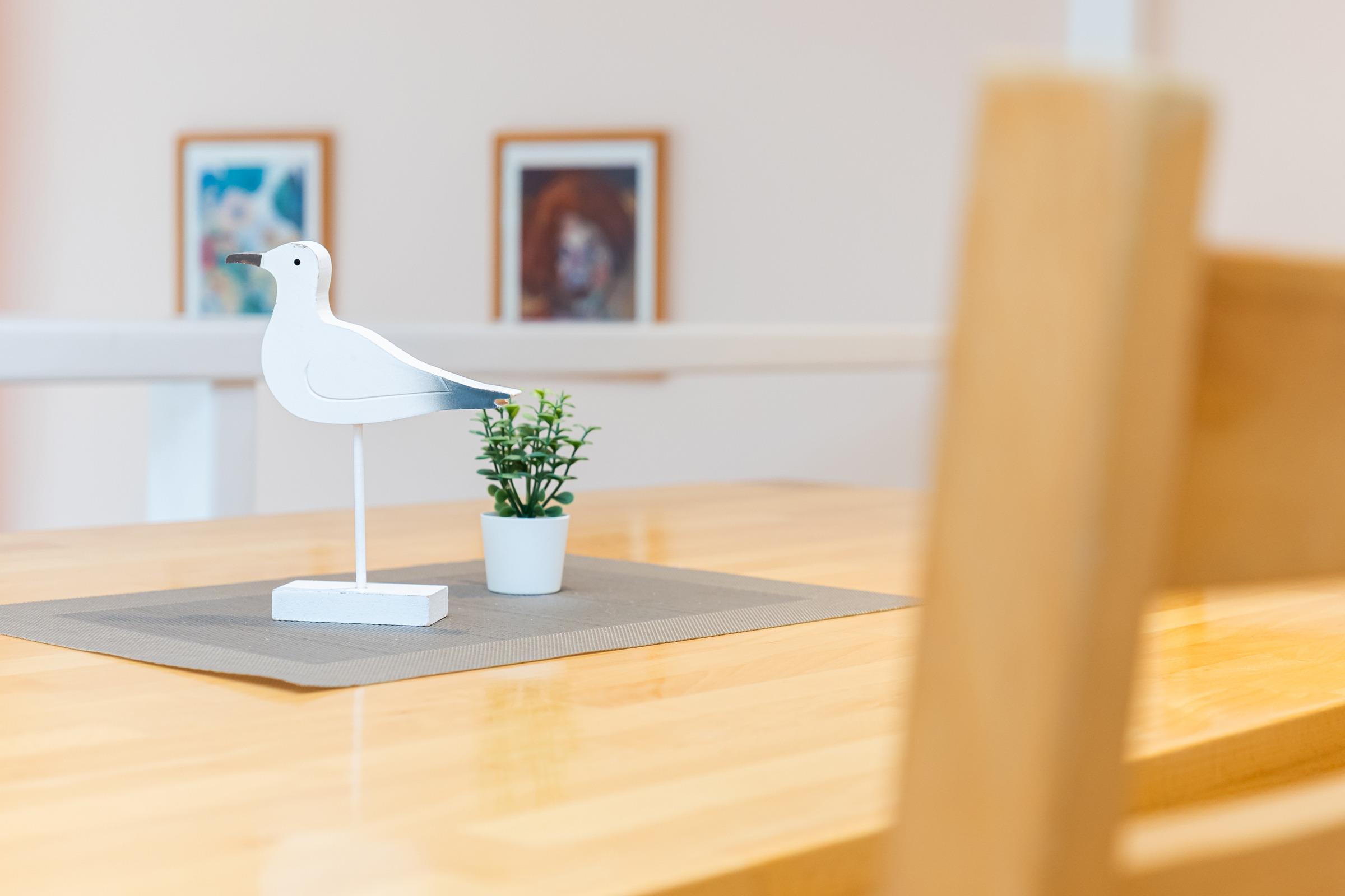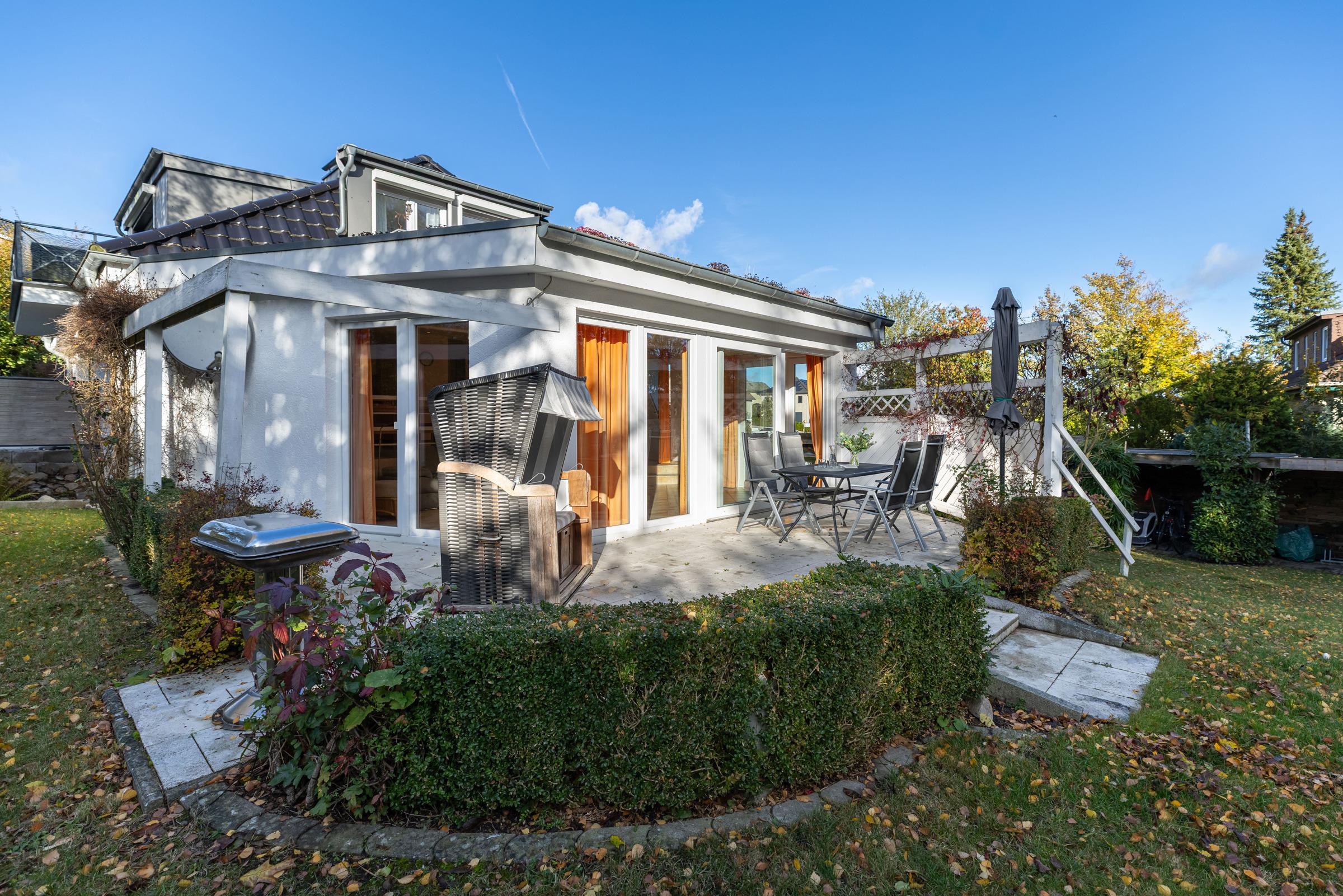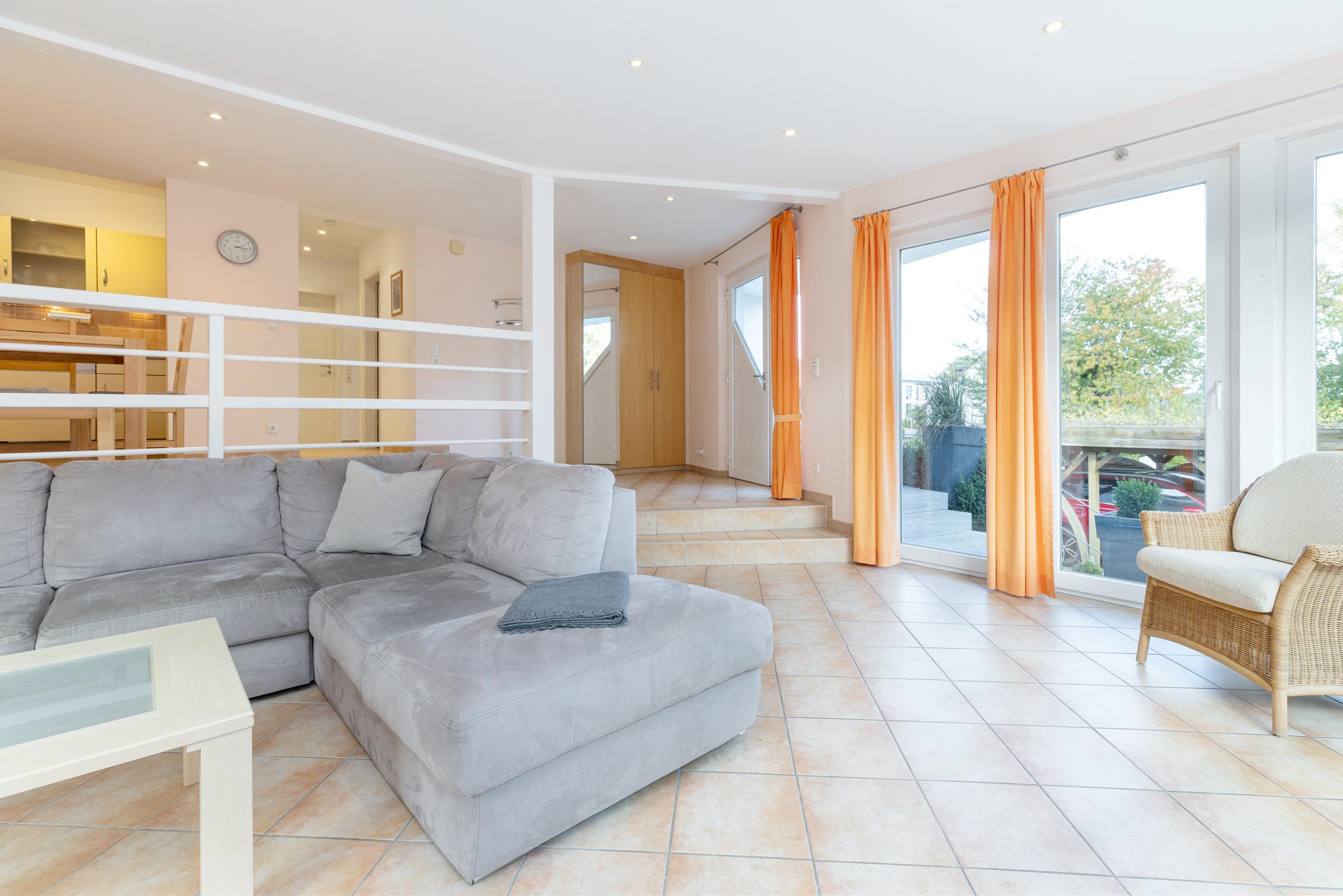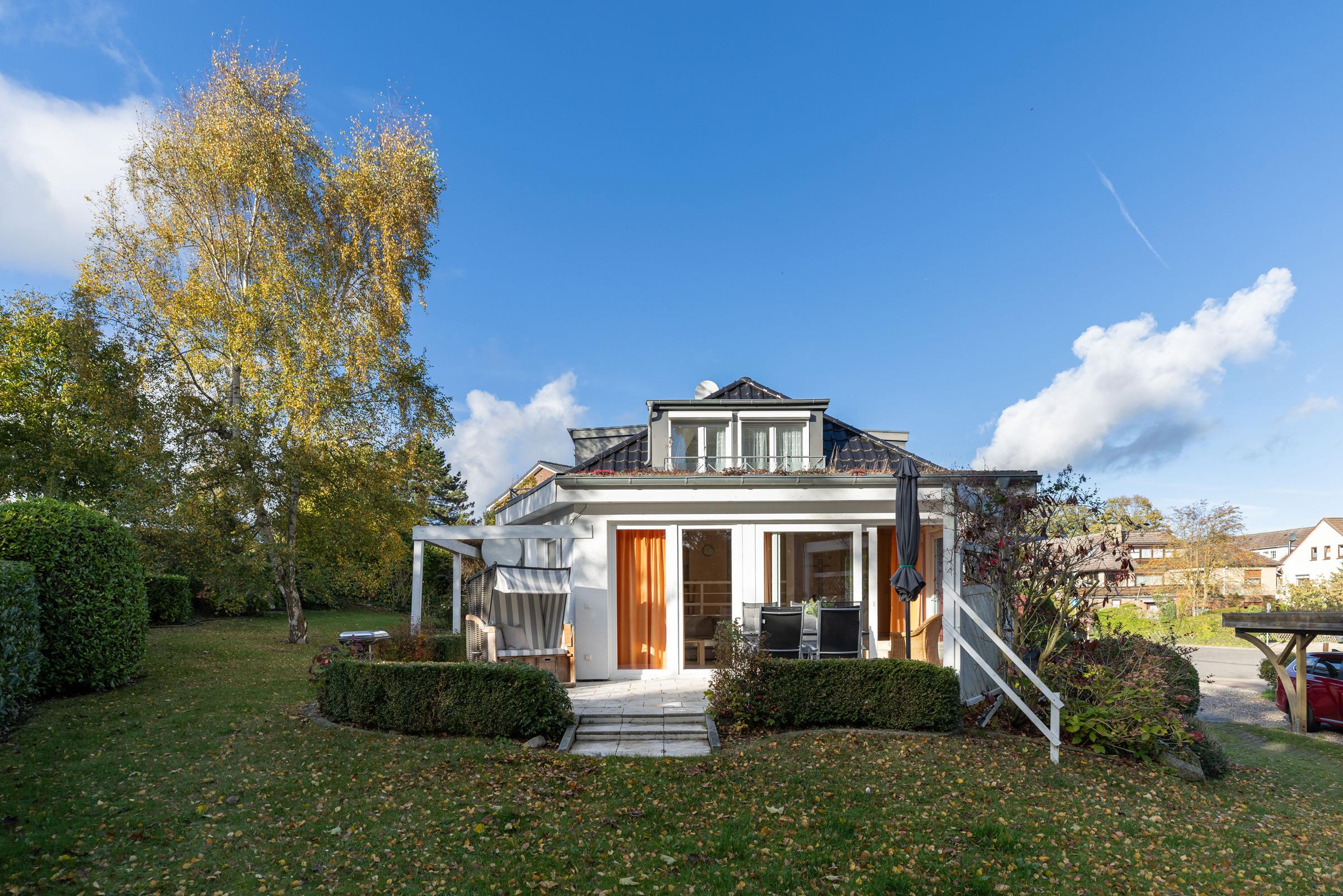 Schon beim Eintreten in den großzügigen Wohnraum empfinden Sie eine besondere Urlaubsfreude. In der oberen Galerie sitzen Sie nah der Küchenzeile am Essplatz und genießen den uneingeschränkten Blick in den Garten und auf die Terrasse u.a. mit Strandkorb und Grill.