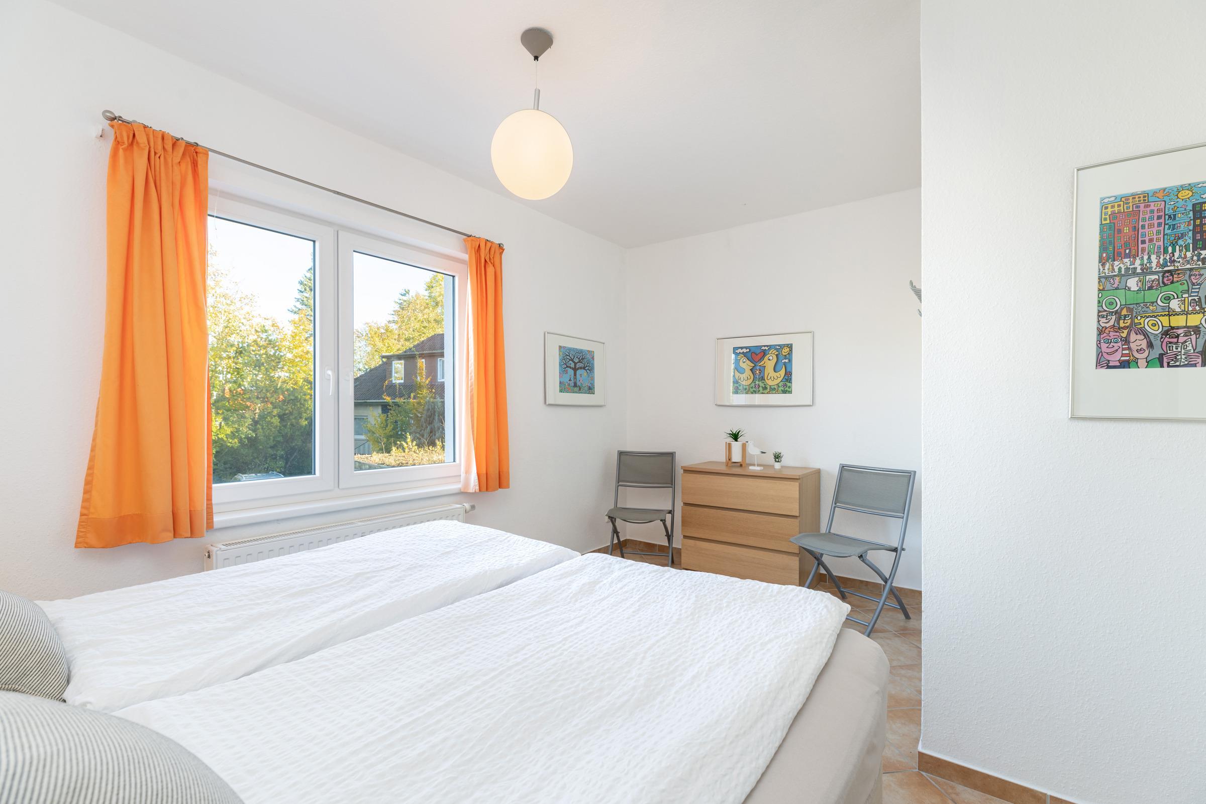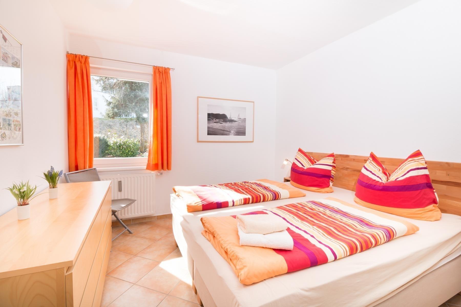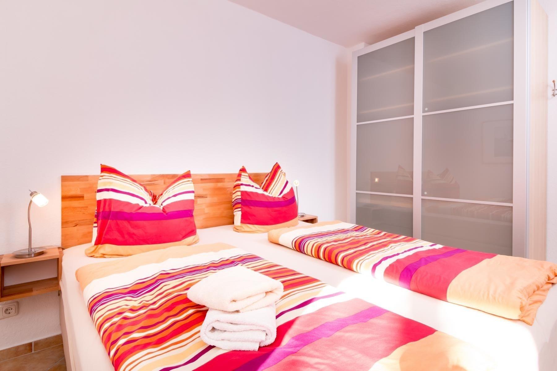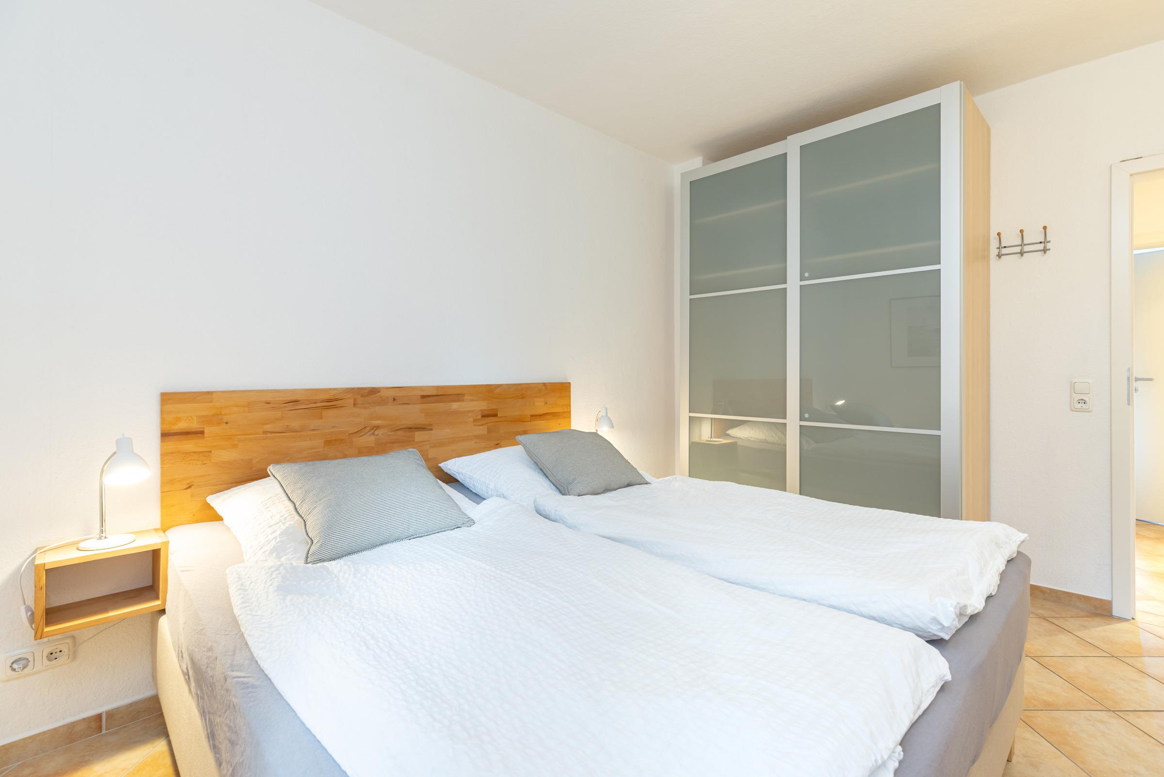 Durch einen schmalen Flur kommen Sie zu den Schlafräumen, Duschbad und Gäste-WC. Das erste Schlafzimmer besteht aus einem Doppelbett (Boxspring, je 90 x 200 cm), Kleiderschrank und Kommode. Das zweite Schlafzimmer hat ebenfalls ein Doppelbett (Boxspring, je 90 x 200 cm) und einen Kleiderschrank.