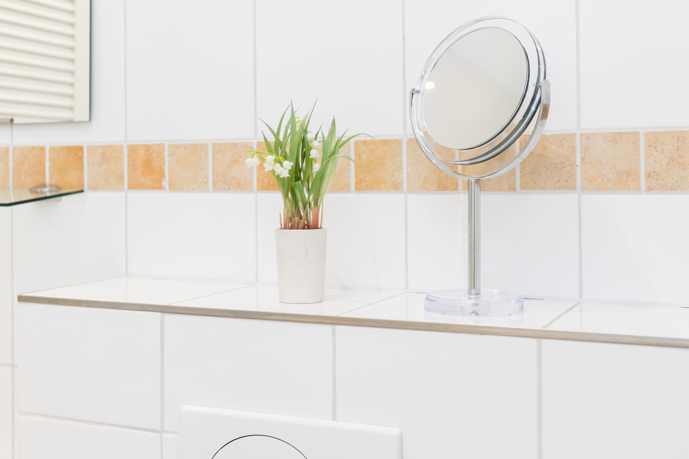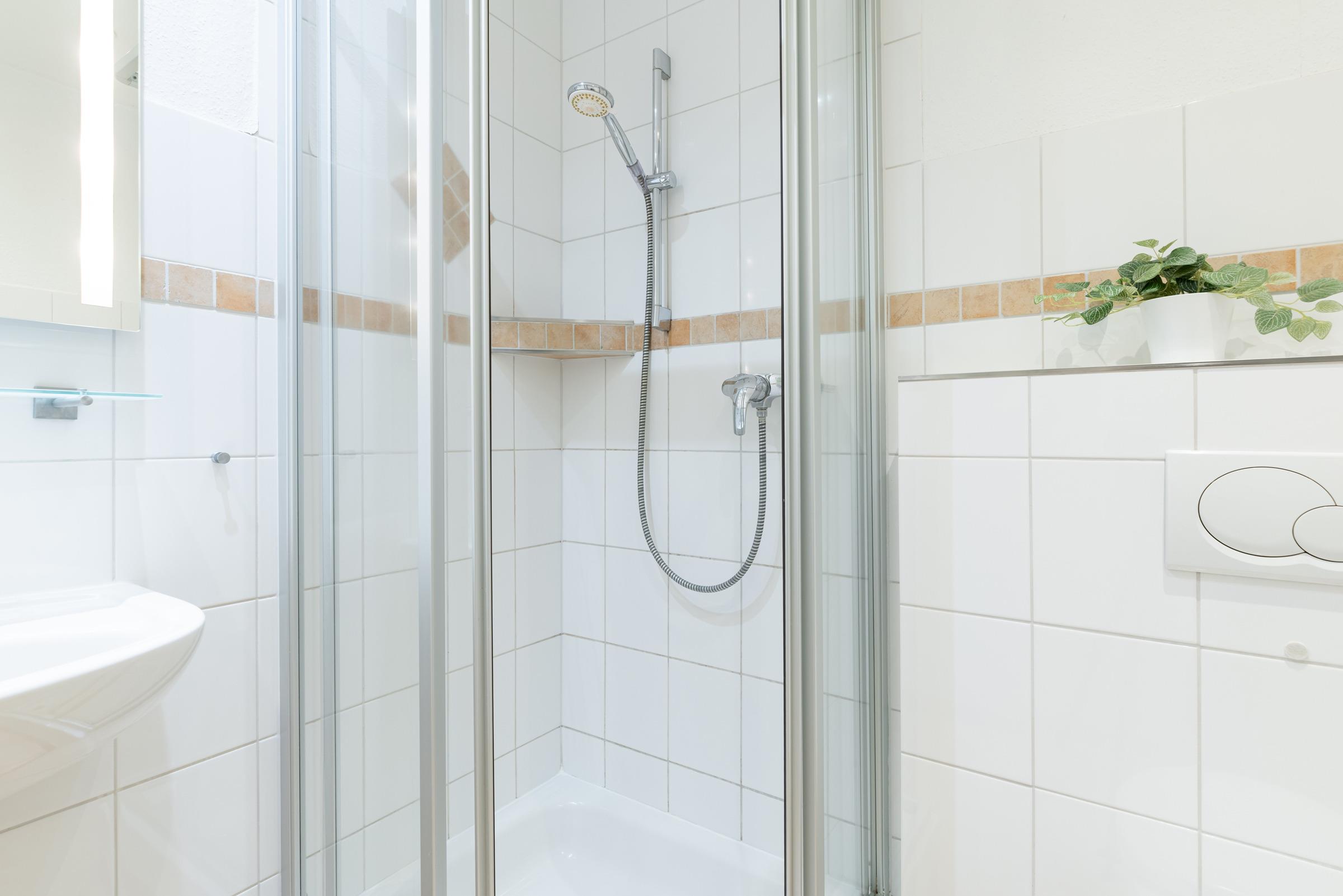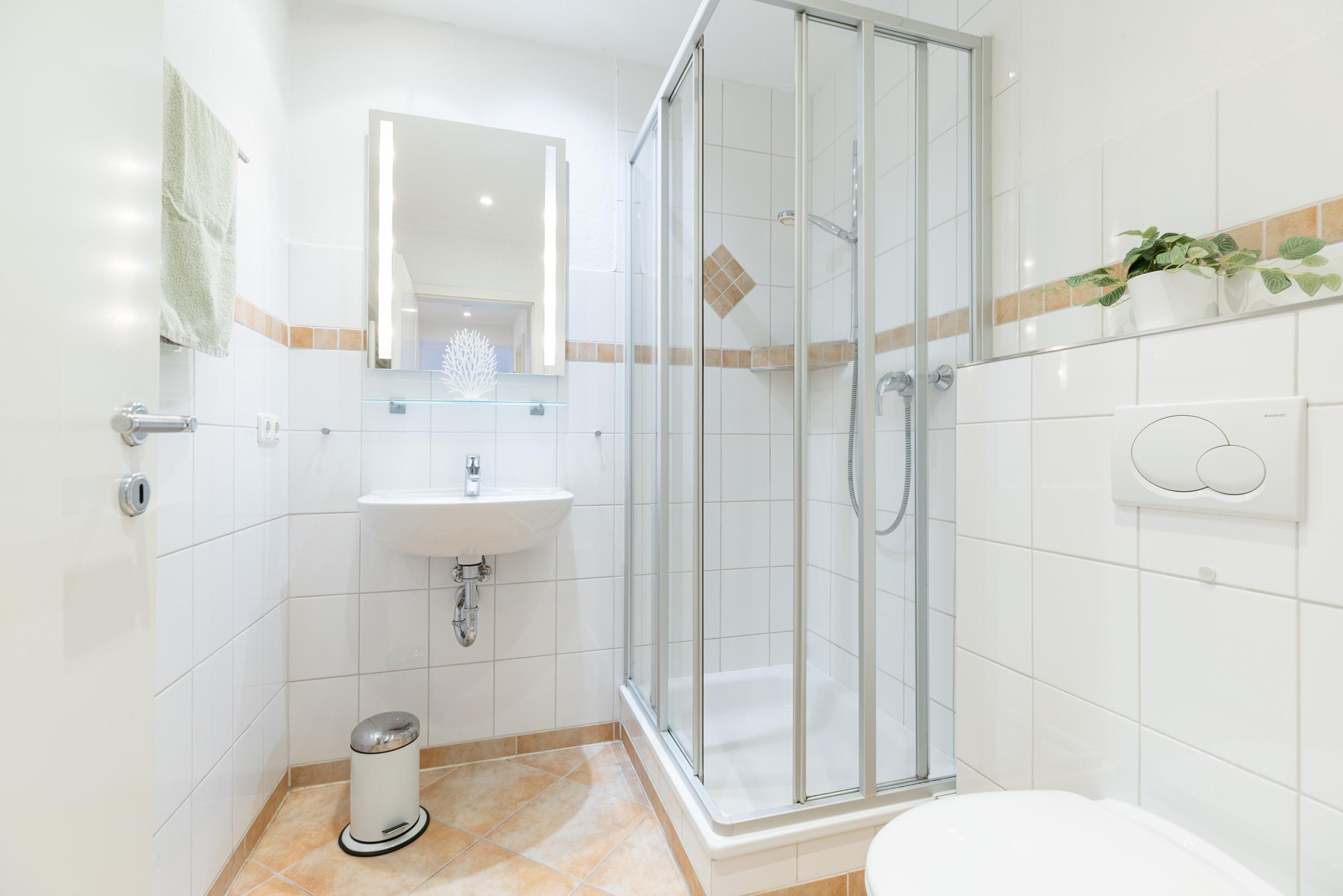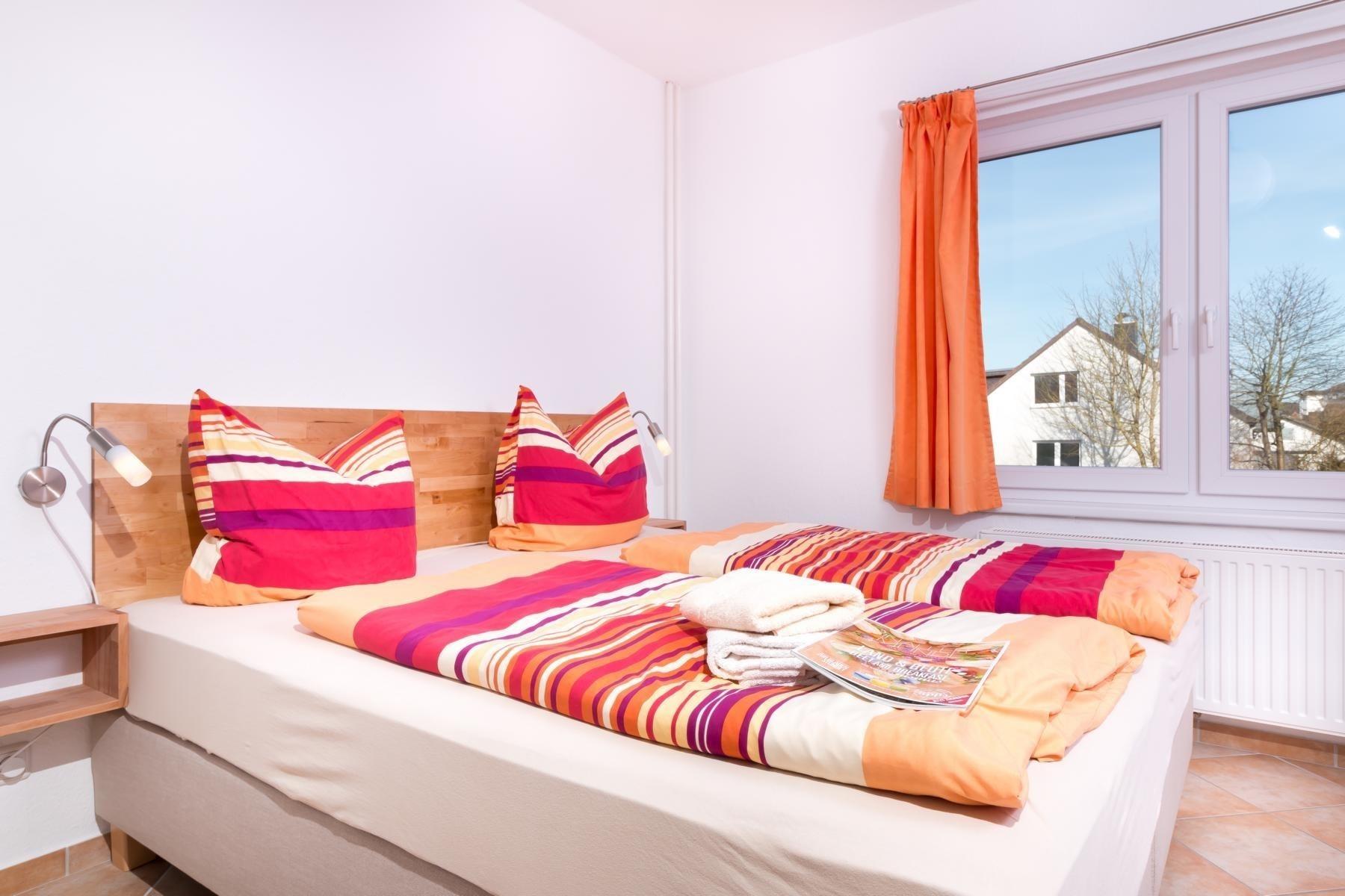 Durch einen schmalen Flur kommen Sie zu den Schlafräumen, Duschbad und Gäste-WC. Das erste Schlafzimmer besteht aus einem Doppelbett (Boxspring, je 90 x 200 cm), Kleiderschrank und Kommode. Das zweite Schlafzimmer hat ebenfalls ein Doppelbett (Boxspring, je 90 x 200 cm) und einen Kleiderschrank.