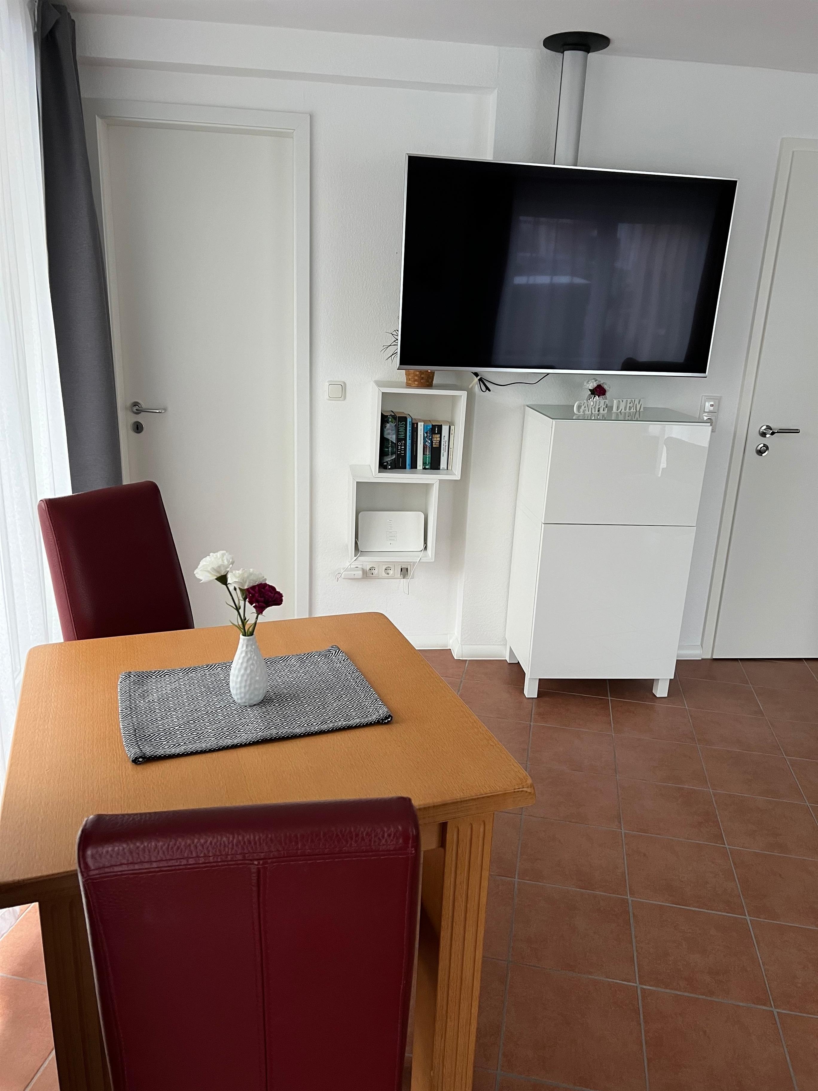 Fernsehvergnügen genießen sie vom Sofa oder Ohrensessel auf einem 55 Zoll Smart-Flat-TV.
