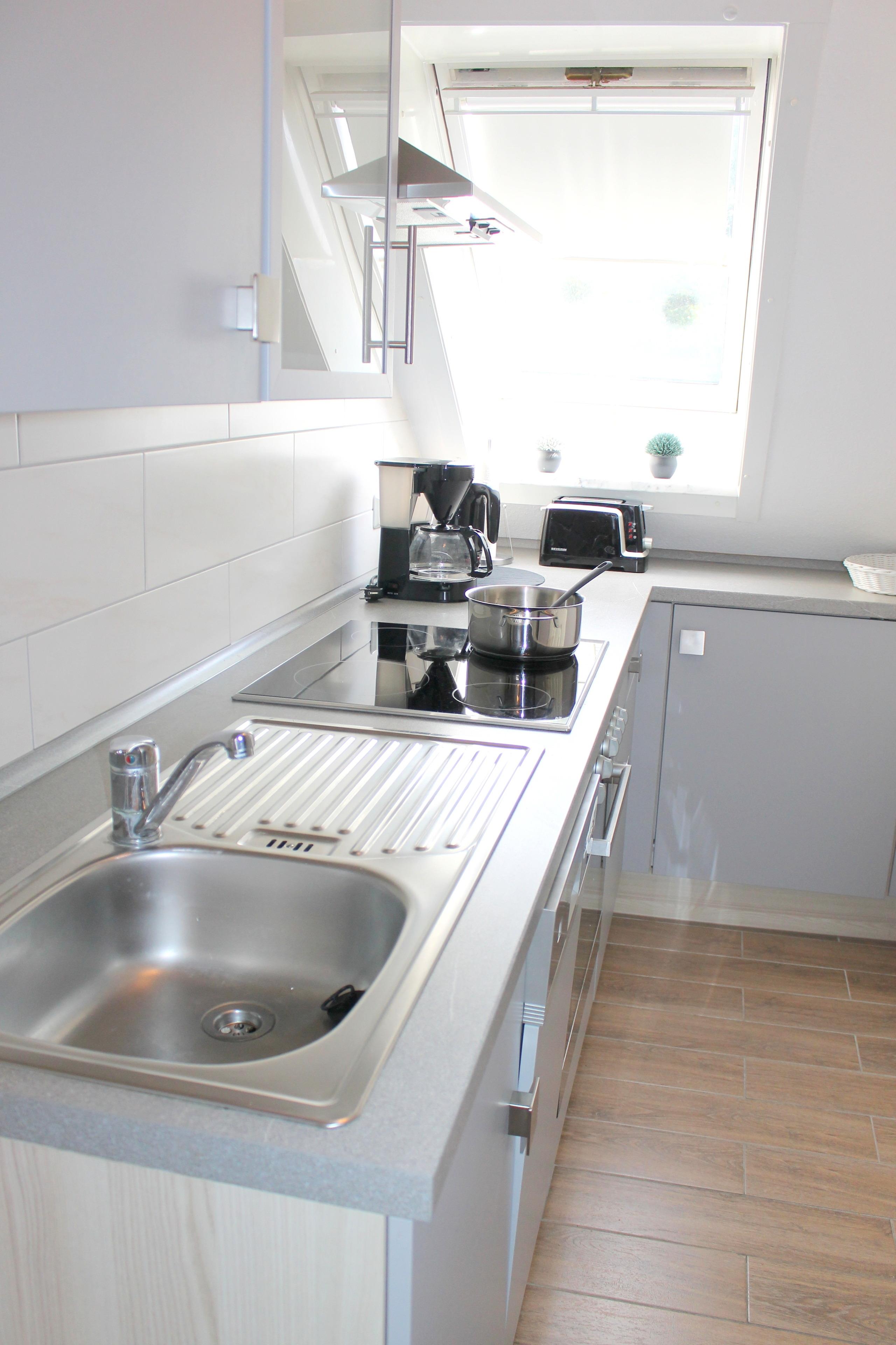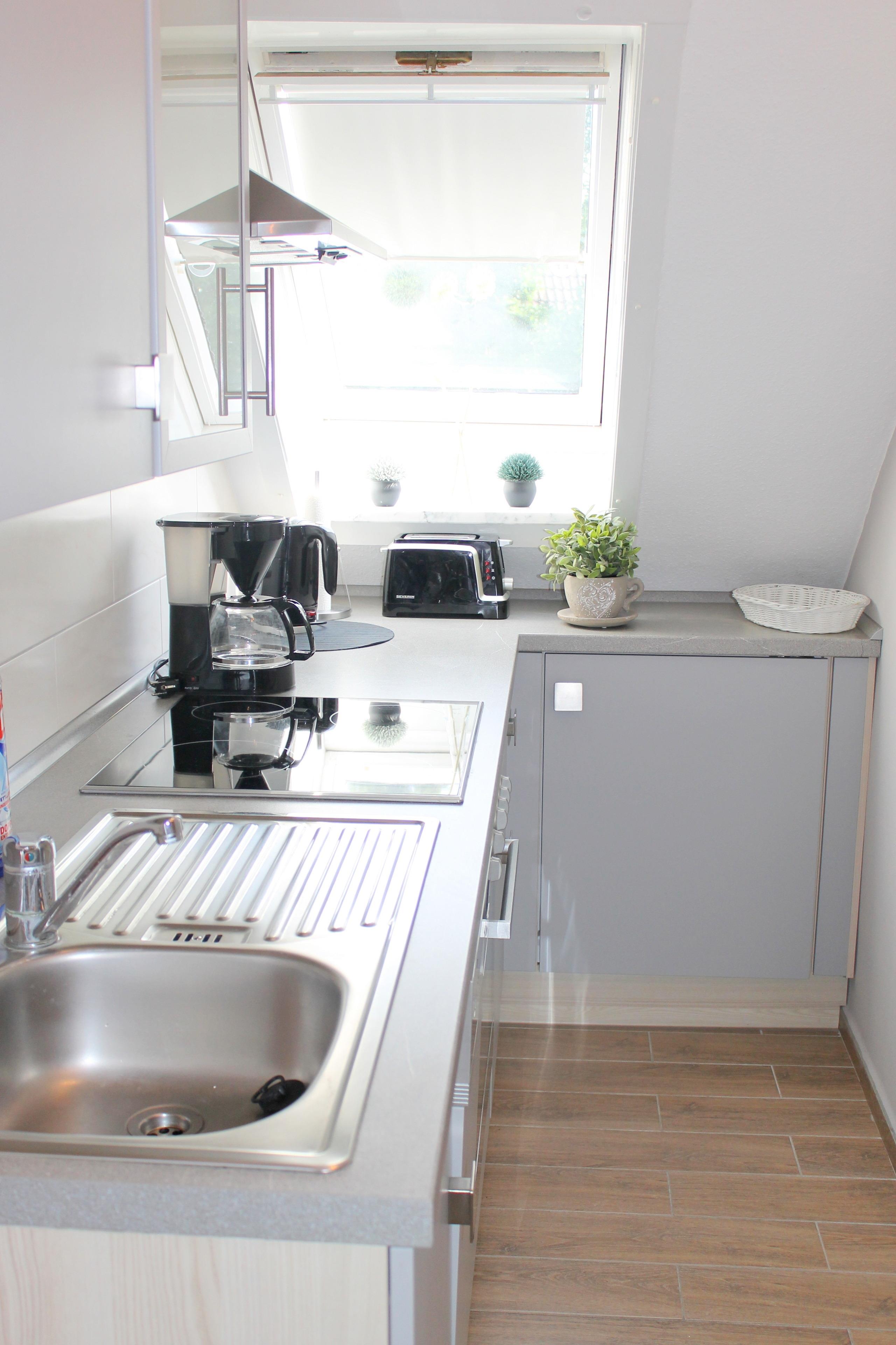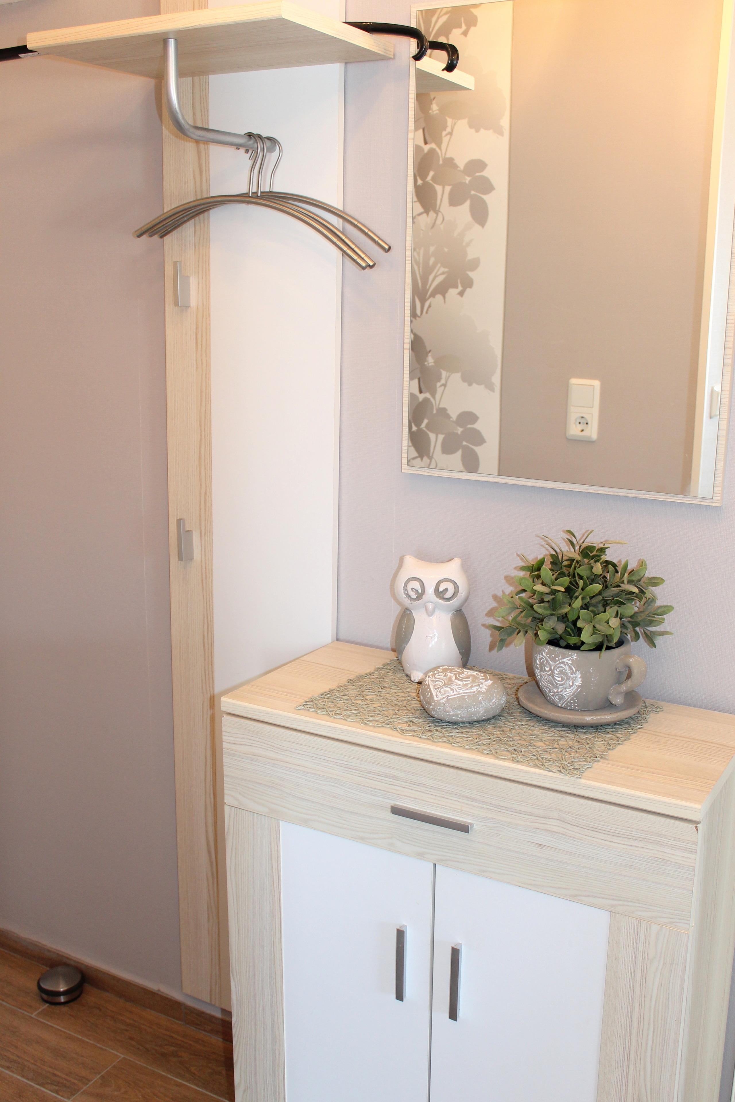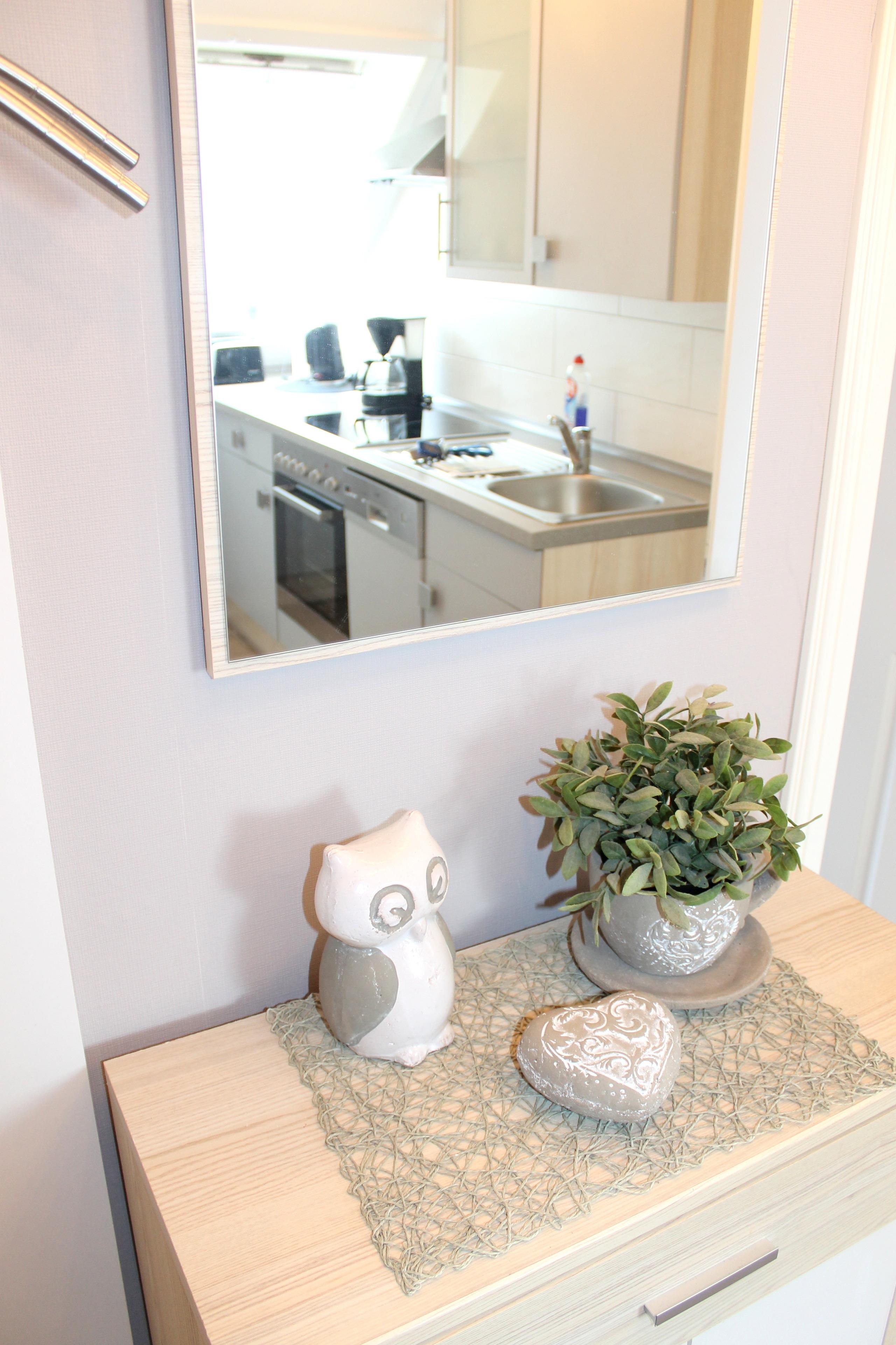 Die Wohnung ist über eine Treppe zu erreichen und besteht aus einem Wohnzimmer, einem Schlafzimmer, Küchenzeile im Flur und einem kleinen Duschbad/WC. Das Wohnzimmer ist mit einer bequemen Schlafcouch (1,60 x 2 m) für zwei Personen ausgestattet, außerdem gibt es einen Essplatz für vier Personen und einen großen Flachbild-Fernseher. Das Schlafzimmer bietet ein Doppelbett (1,80 x 2) und ausreichend Schrankplatz. Die Küchenzeile ist mit Backofen, 4-er Ceranfeld und Spülmaschine sowie den üblichen Kleingeräten ausgestattet. Der Balkon ist zur Südseite ausgerichtet und mit Balkonstühlen- und tisch ausgestattet.