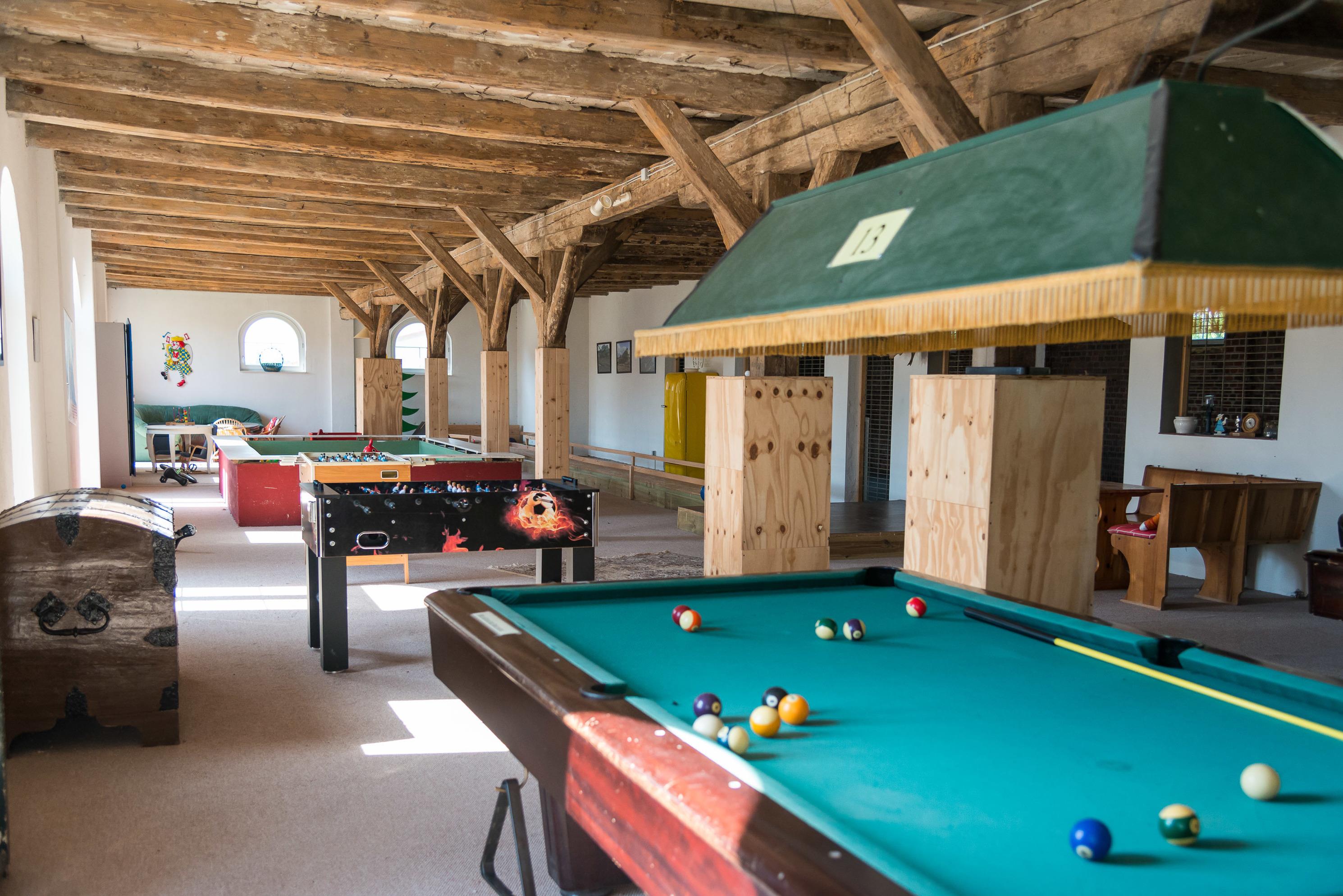 Falls das Wetter einmal nicht mitspielt wird es in der über 400 qm großen Spielscheune nicht langweilig. Sie beheimatet auf 2 Ebenen Bällebad, Kicker, Tischtennisplatte, Trampolin, Hüpfburg, Kegelbahn, Billiardtisch und einiges mehr.