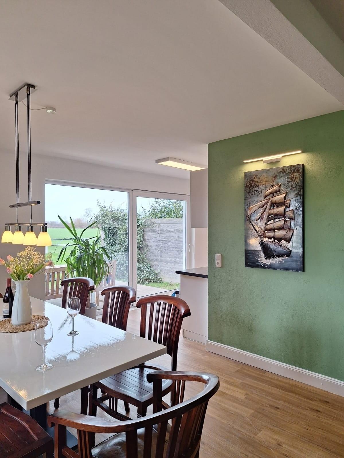 Die Küche ist komplett eingerichtet mit Mikrowelle, Backofen und Spülmaschine uvm.. Auch das Wohnzimmer bietet mit Sat-TV, DVD-Player sowie WLAN moderne Bequemlichkeit.