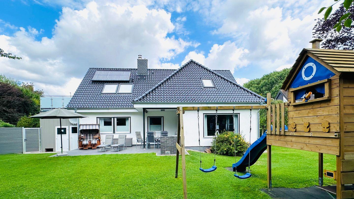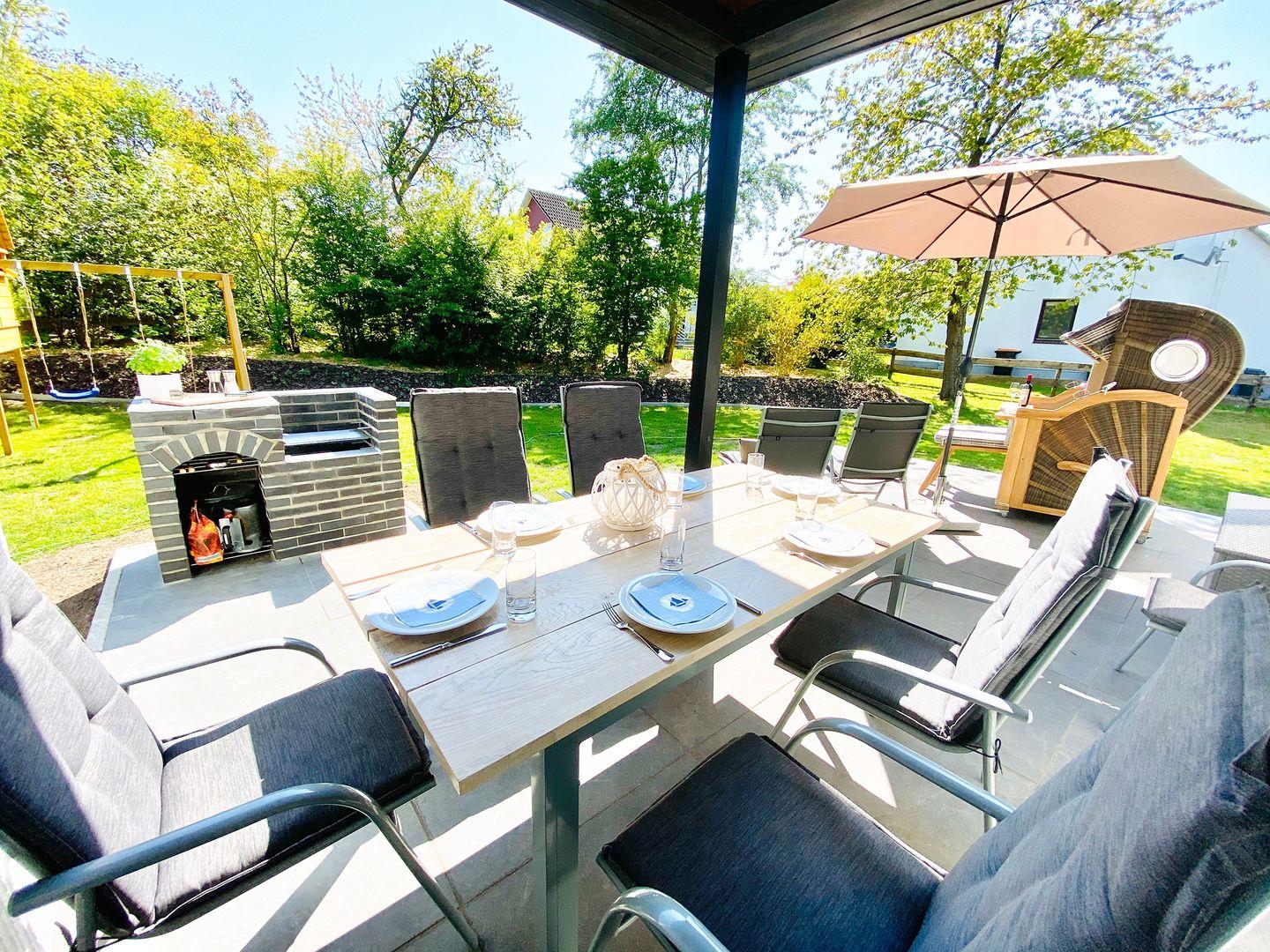Genießen Sie den großzügigen Garten des 'tohuus' mit einer 30 m2 großen, teilüberdachten Südwest-Terrasse und einem Klettergerüst. Hier finden Sie einen Esstisch für 6 Personen, einen großen Holzkohle-Grill, einen extra großzügigen Strandkorb, zwei bequeme Liegen und einen Sonnenschirm.