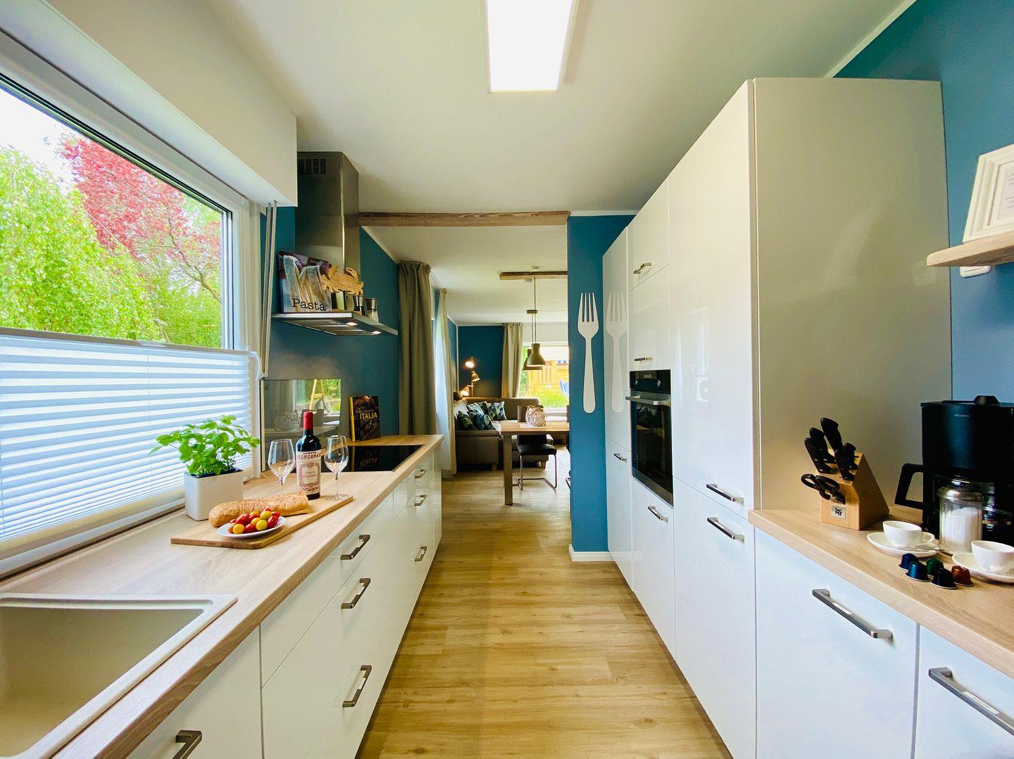 Die hochwertige Küche ist an das Wohn-/Esszimmer angegliedert. Genießen Sie gesellige Koch- oder Backerlebnisse, denn es ist alles vorhanden: Backofen, Mikrowelle, Spülmaschine, großer Kühlschrank mit Gefrierfach, Induktionskochfeld und div. Elektrogeräte (z.B. Kaffeemaschine, Kapselmaschine, Toaster). Aber auch die kleinen Dinge wie ausreichend Küchengeschirr, Geschirrhandtücher, Backpapier, Spülmaschinen-Tabs und Kochbücher stehen für Sie bereit.