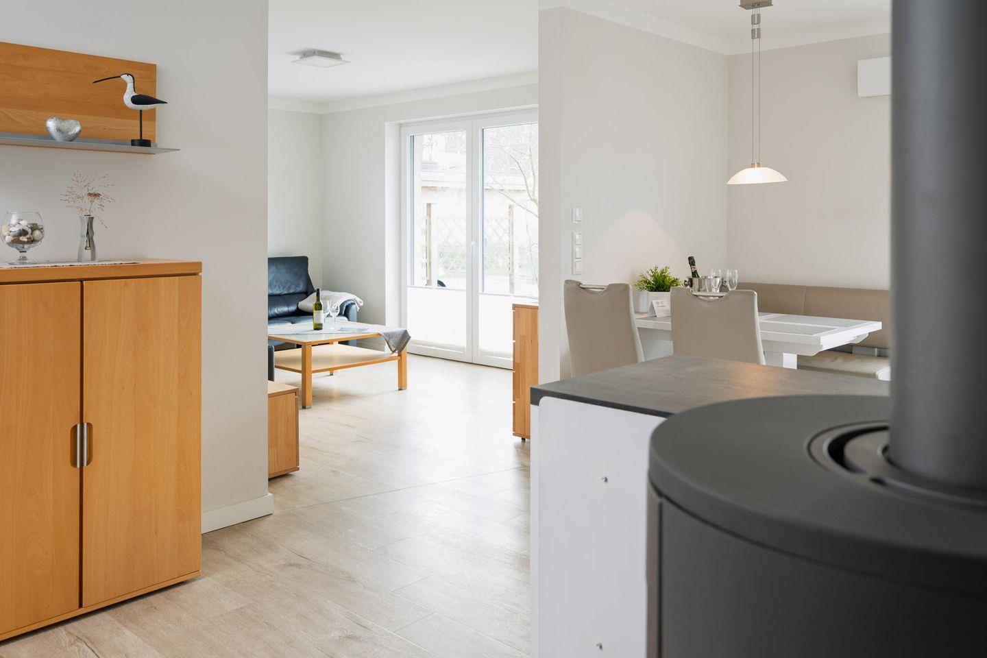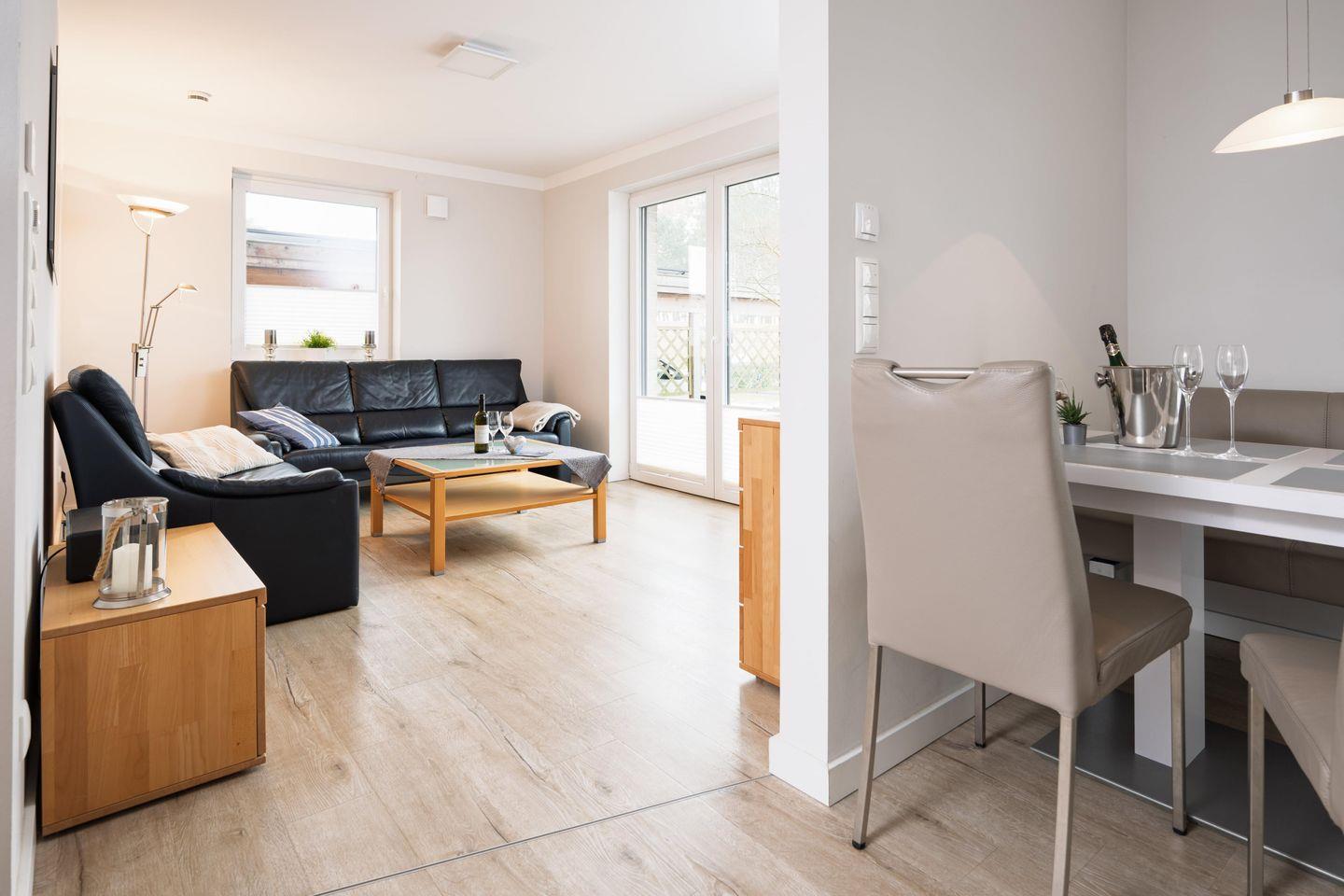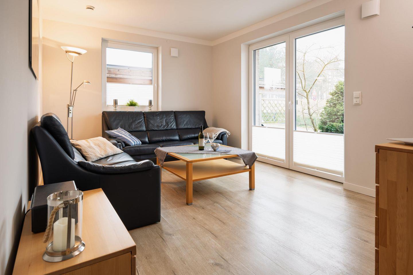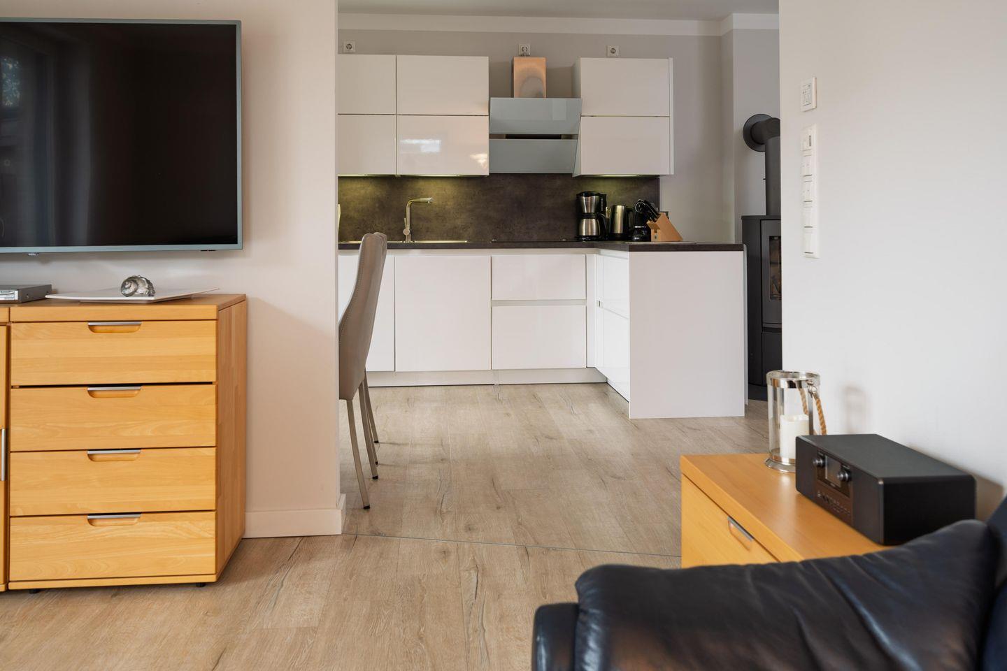 Die Küche ist komplett ausgestattet. Zudem gibt es einen separaten Essplatz. Im abgeteilten Wohnbereich erwartet Sie ein 55 Zoll Smart-TV. Wir bieten Ihnen schnelles und kostenloses WLAN (bis zu 1.000 Mbit/s). Das Tageslicht-Bad mit Badewanne, ebenerdiger Dusche und Sauna lässt keine Wünsche offen. Alle Zimmer sind durch elektrische Rollläden verdunkelbar und haben Fußbodenheizung. Auf der großzügigen Südwest-Terrasse mit Gartenmöbeln und Strandkorb lässt es sich herrlich entspannen. Ein separater Raum mit kostenfreier Nutzung von Waschmaschine und Trockner ist im Haus, zudem ist ein Abstellraum vorhanden, sowie ein PKW Stellplatz.