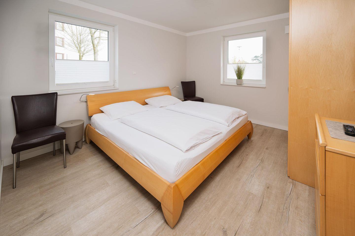 Es sind nur wenige Schritte zum Strand und zur Ostsee. Auf 74m² befinden sich zwei Schlafzimmer. Eins mit Doppelbett (200x200cm) und 50 Zoll Smart-TV, das zweite mit zwei getrennten Betten (90x200cm). Der angegebene Preis bezieht sich immer auf 2 Erwachsene und 2 Kinder, extra Personen können ggf. auf Anfrage dazu gebucht werden.