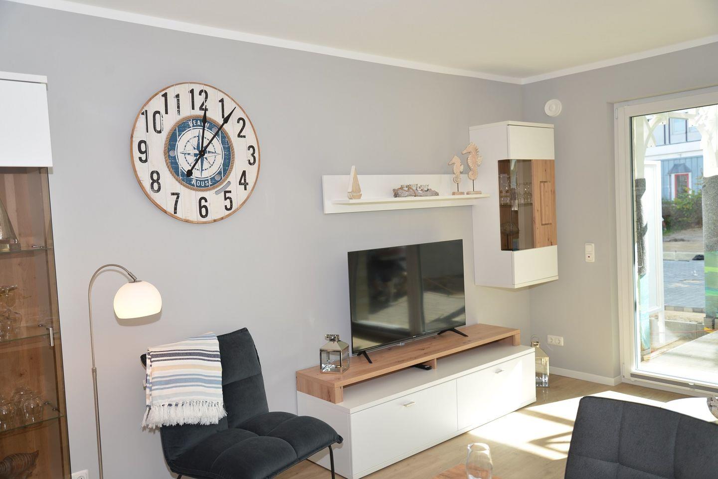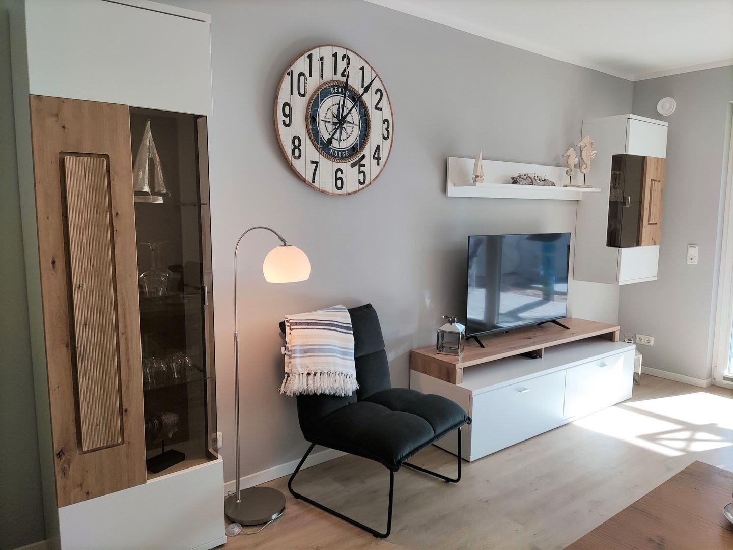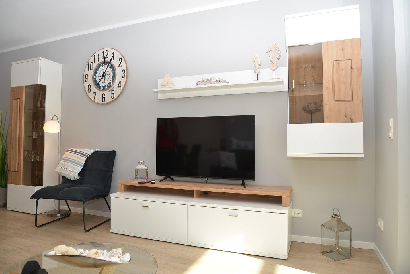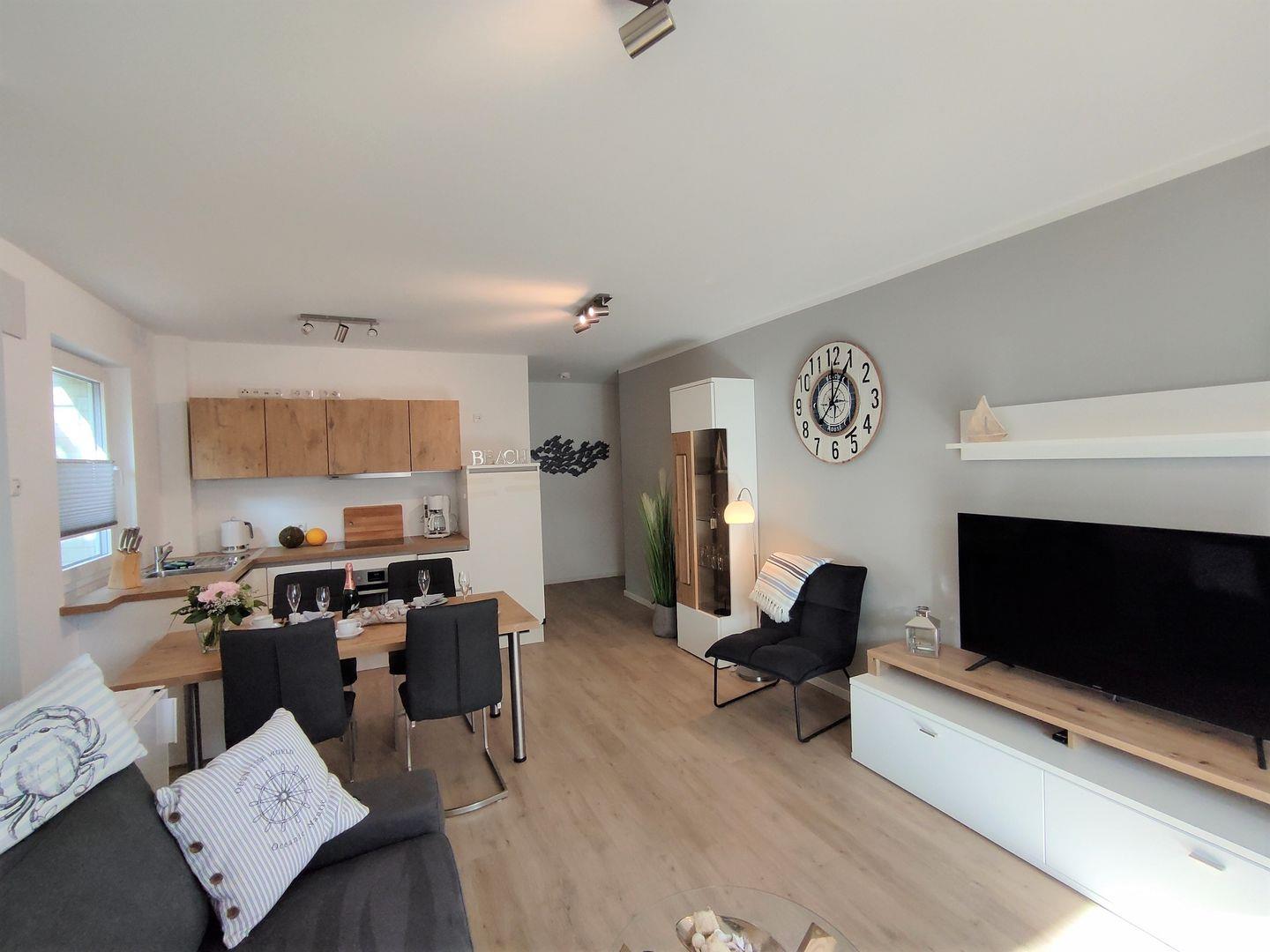 Das helle Wohnzimmer verfügt über eine offene Einbauküche mit sämtlichen Küchengeräten, sowie einem Essplatz für 4 Personen und einer gemütlichen Sofaecke und einem 50´ Zoll Flachbildfernseher.