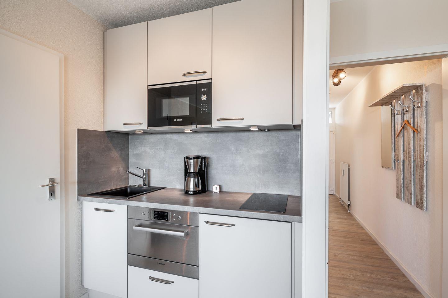 Die Küche befindet sich im Wohnzimmer und ist ausgestattet mit sämtlichen Küchengeräten, die Sie für Ihren Urlaub benötigen.