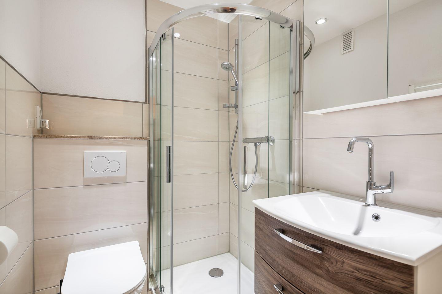 Das hell geflieste Badezimmer hat eine Dusche, Spiegelschrank, Waschtisch und Handtuchheizung.