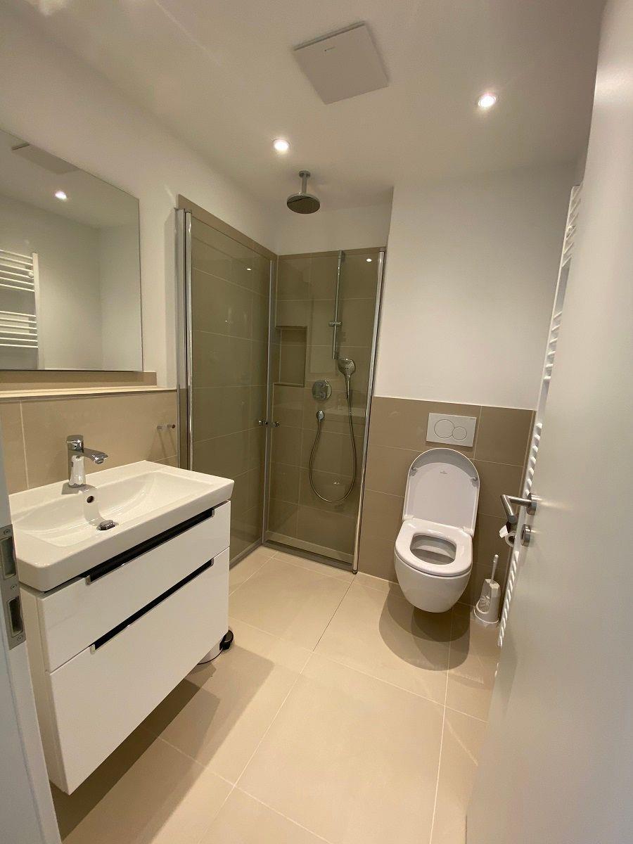 Ihre moderne Design-Küche im edlen Weiß verwöhnt Sie mit Cerankochfeld, Mikrowelle, Backofen, Geschirrspüler sowie einer Kaffeemaschine, Wasserkocher und Toaster. Ihr Bad bietet Ihnen eine ebenerdige Dusche, WC und Waschtisch. Ein beheizter Handtuchhalter versteht sich von selbst.
