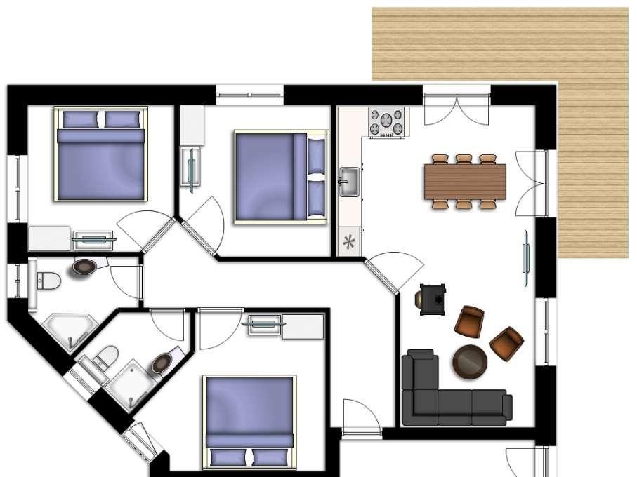 Eine offene Küche, ein Essbereich sowie eine gemütliche Sofaecke mit Kaminofen laden Sie ein, Ihren Urlaub in vollen Zügen zu genießen!