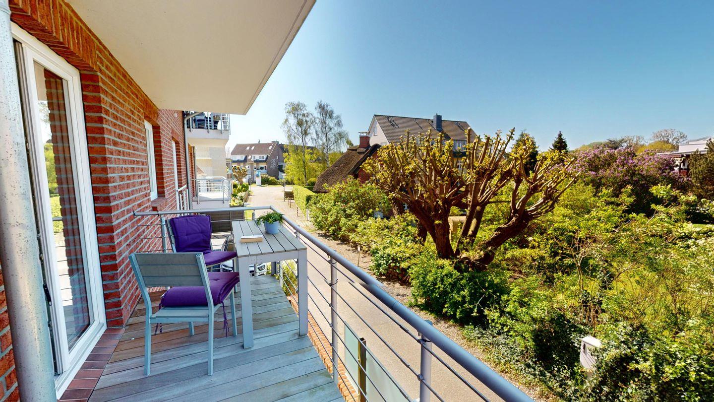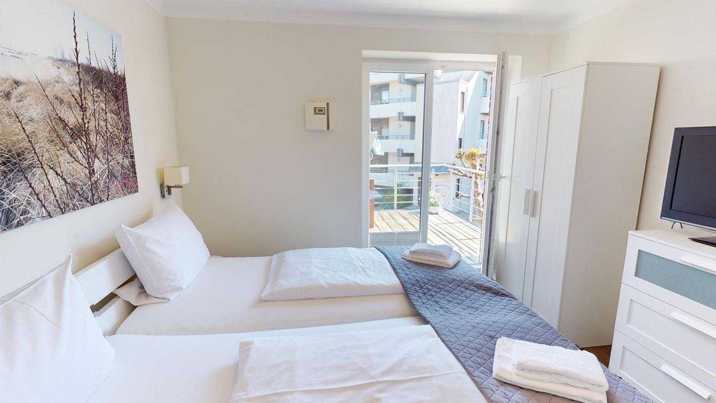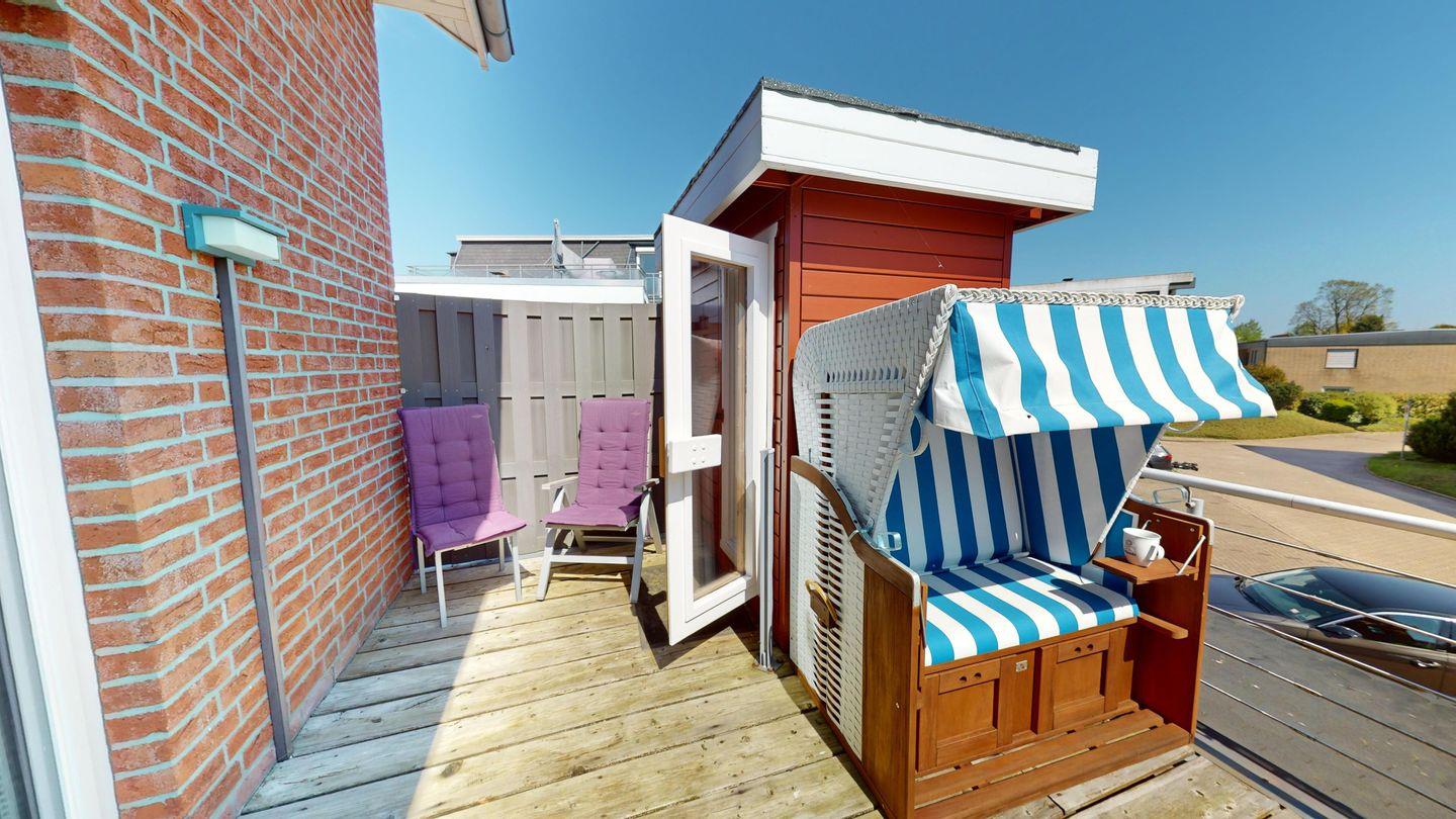 Dieses helle 3-Zimmer-Ferienapartment hat eine Wohnfläche von ca. 75 m² und bietet mit zwei Schlafzimmern, Duschbad, Wohnzimmer mit offener Küche, Dachterrasse und Eckbalkon Platz für 4 Personen.