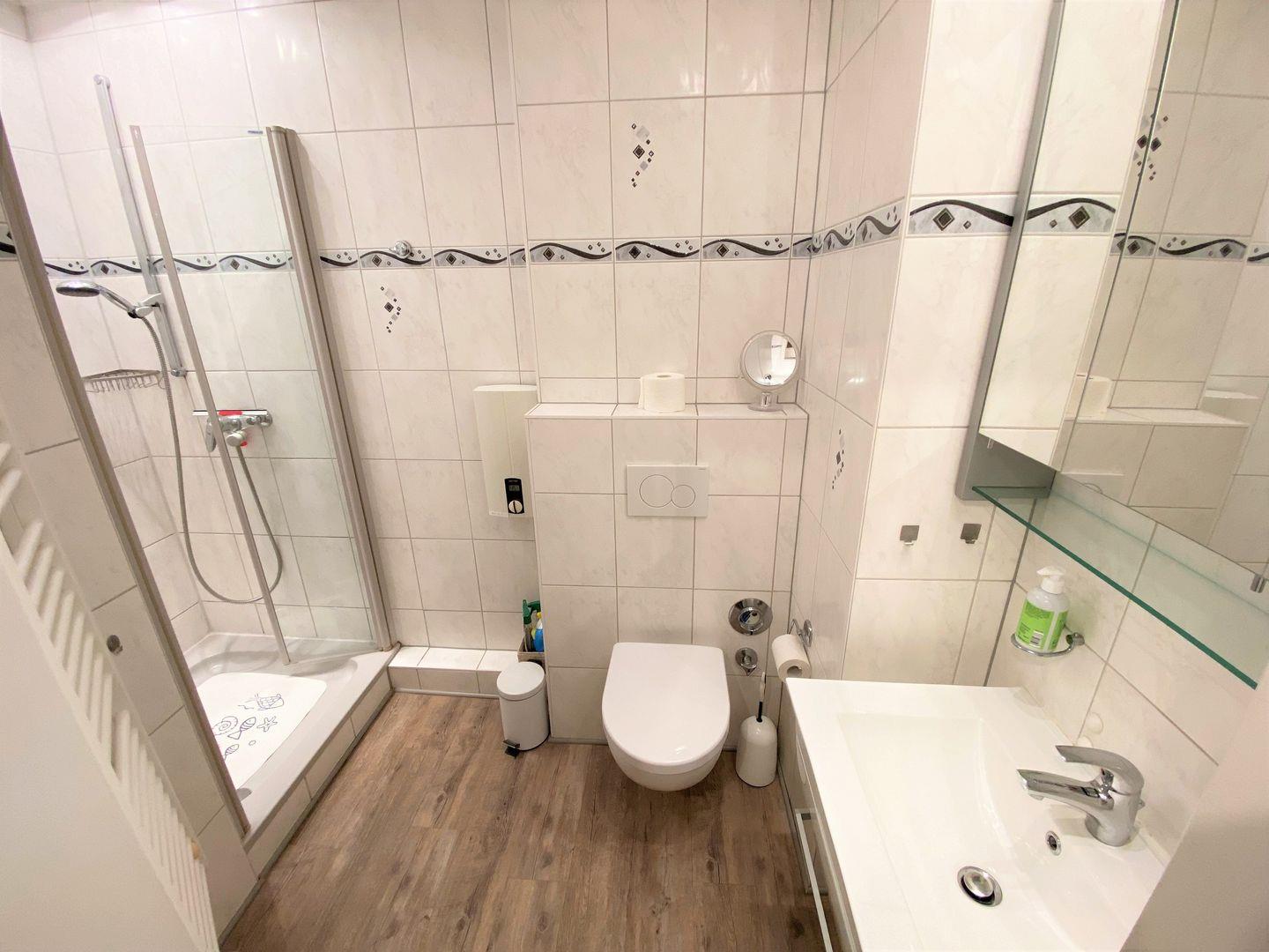 Das helle Badezimmer ist mit einer Dusche, Handtuchheizkörper, sowie WC, Waschbecken, Haartrockner und Spiegel eingerichtet.