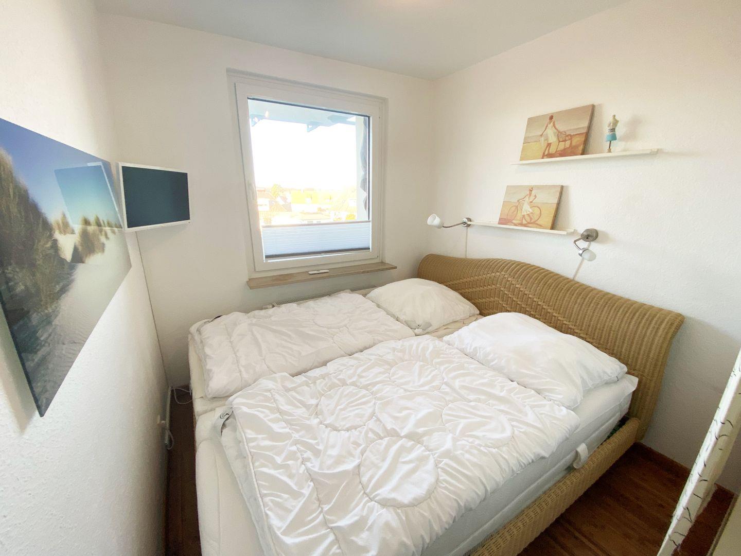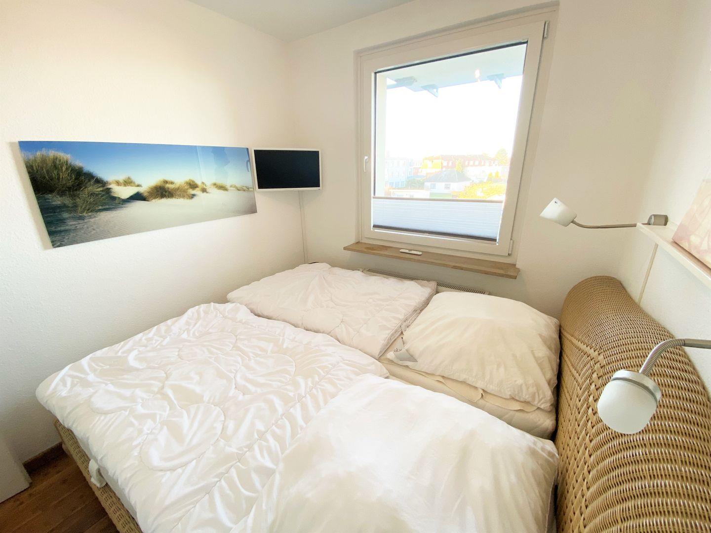 Das Schlafzimmer ist mit einem Doppelbett (180 x 200 mit 2 Matratzen),einem Flachbildfernseher und Ablageflächen möbliert.