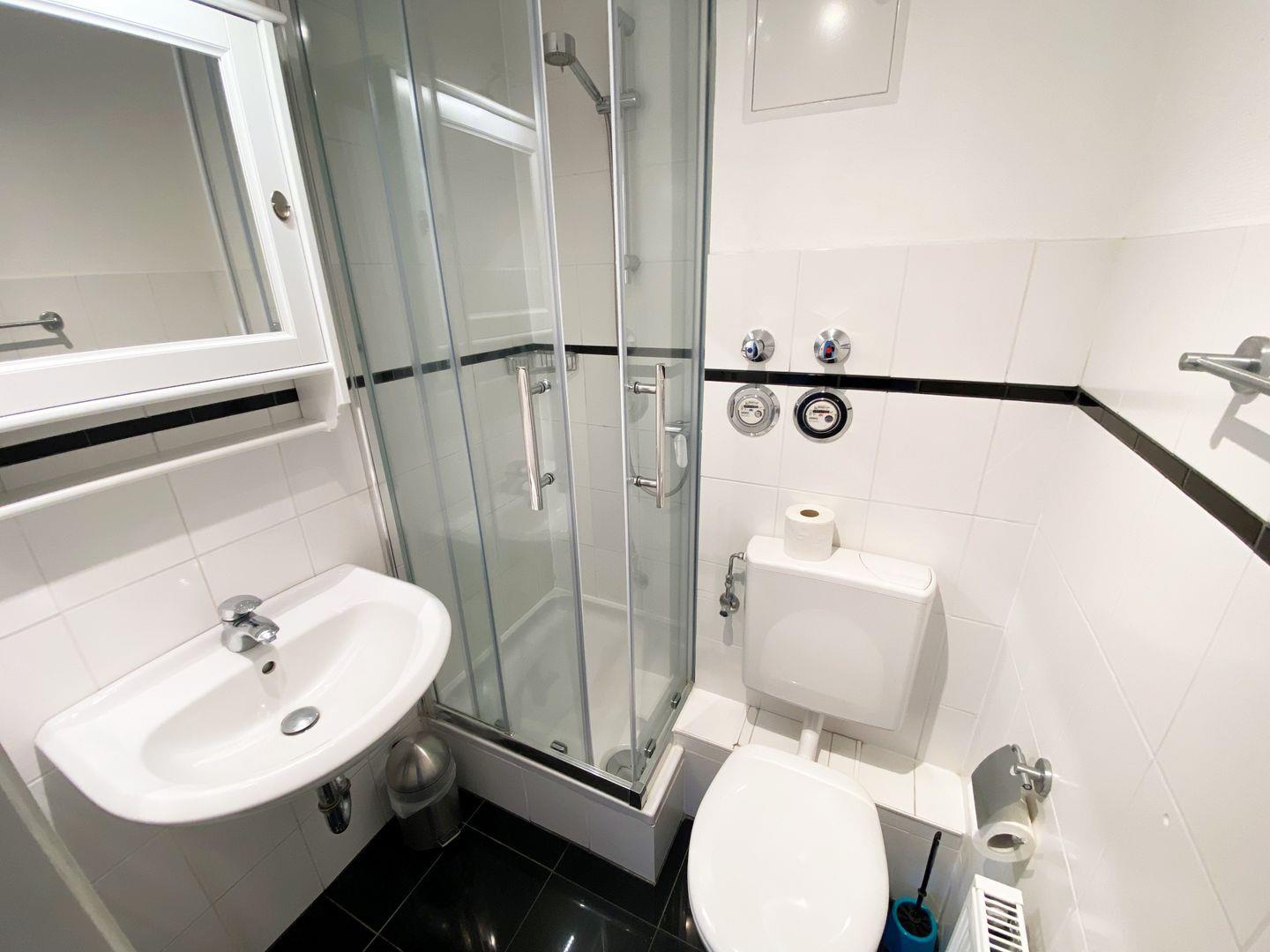 Das kleine Badezimmer ist mit einer Dusche, WC und Waschbecken ausgestattet.