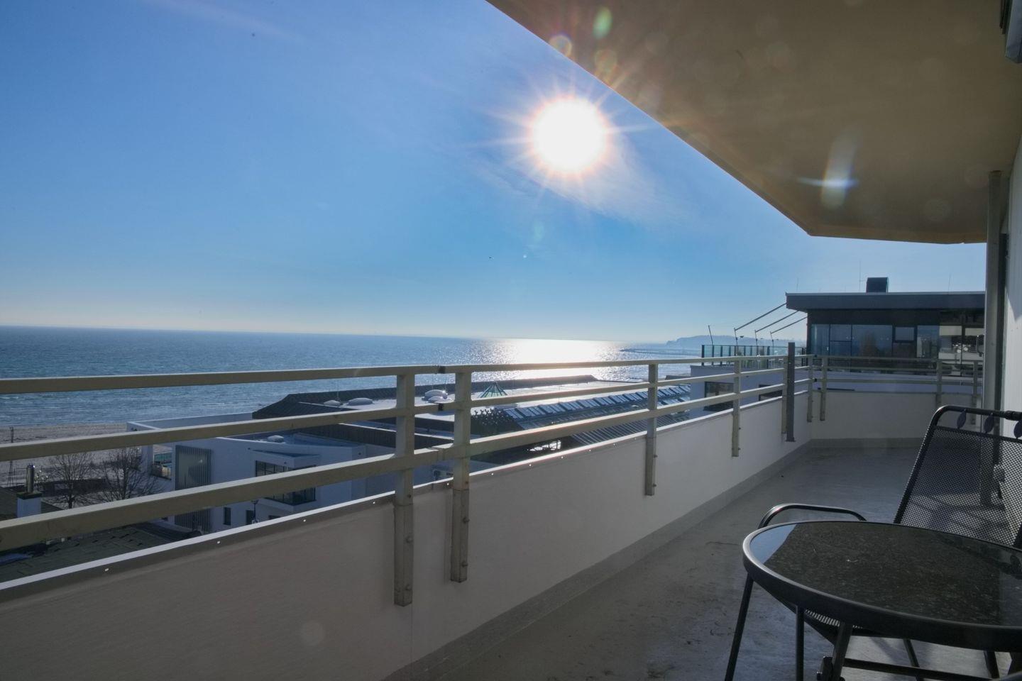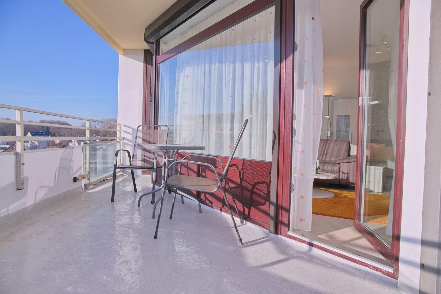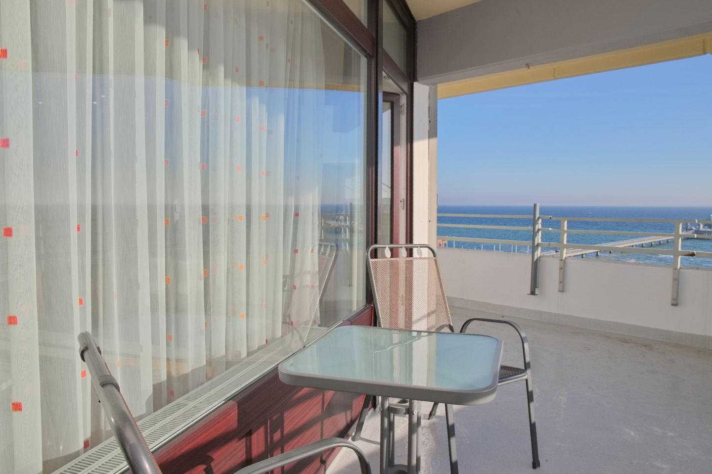 Moderne Ferienwohnung in Grömitz mit Eckbalkon und direktem Meerblick, ideal für entspannte Urlaubstage am Strand.
