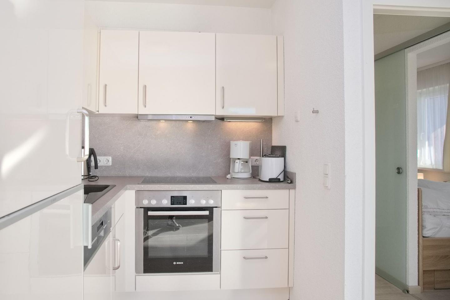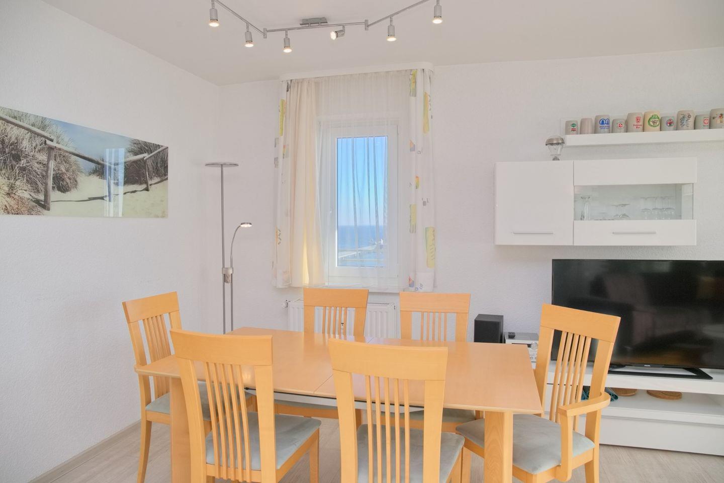 Das Wohnzimmer verfügt über eine große Schlafcouch, eine Flach-TV, Radio/CD (USB und Bluetooth) und eine Essecke mit 5 Stühlen. Hier können Sie mit Ihrer Familie den Abend gemütlich ausklingen lassen, Die zum Wohnzimmer offene Einbauküche ist mit einem Induktionsfeld, einem Backofen, Kühl- und Gefrierschrank, Geschirrspüler, Kaffeemaschine, Wasserkocher und einem Toaster ausgestattet.