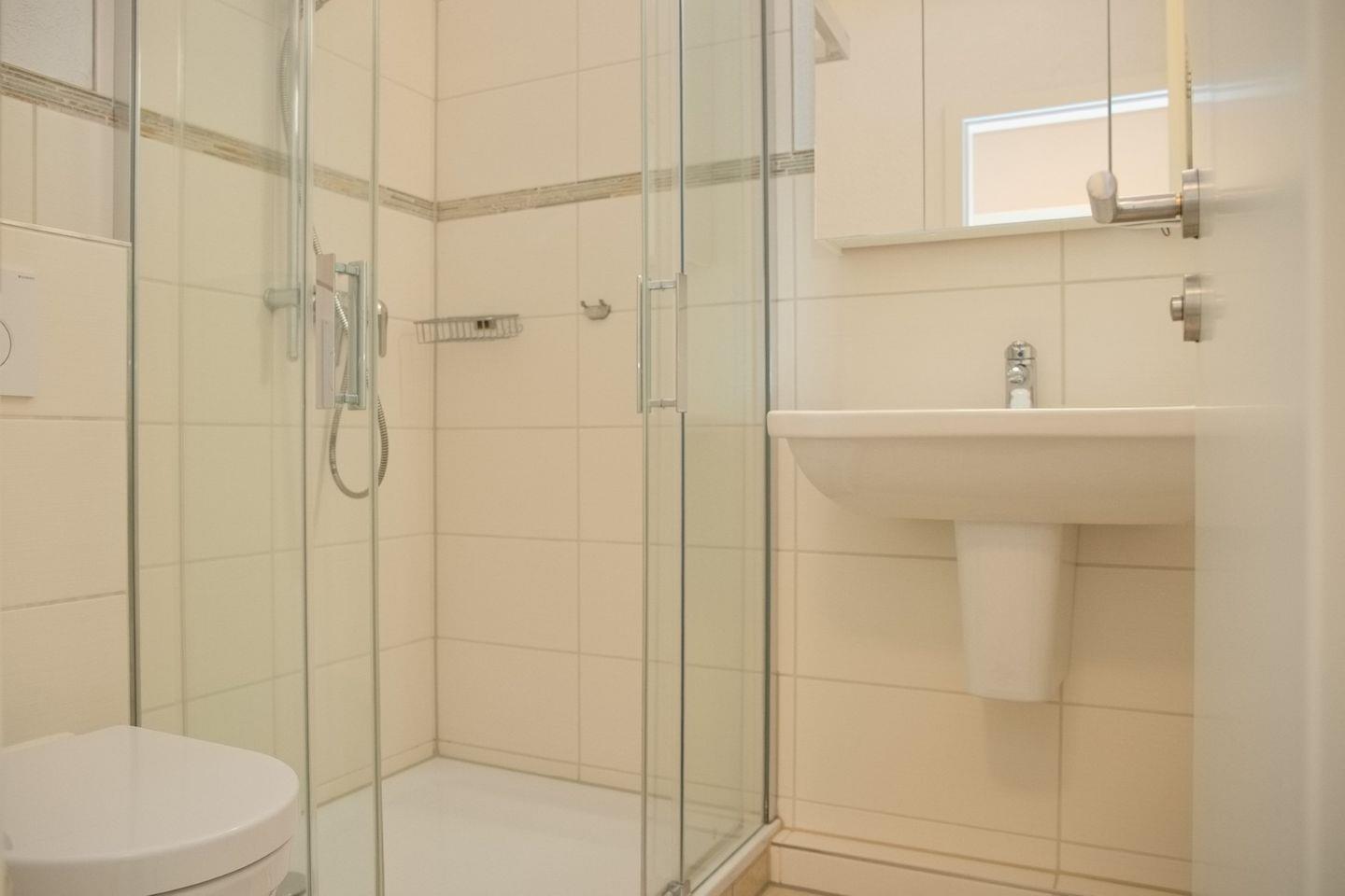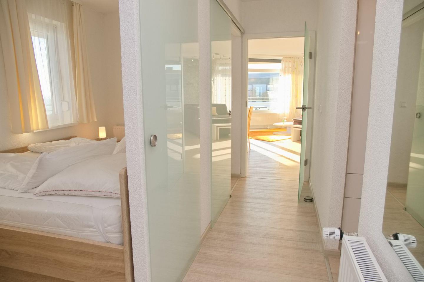 Im Schlafzimmer befinden sich ein Doppelbett (200 x 200 cm) und ein Kleiderschrank. Die Wohnung verfügt über ein Tageslicht-Duschbad/WC.