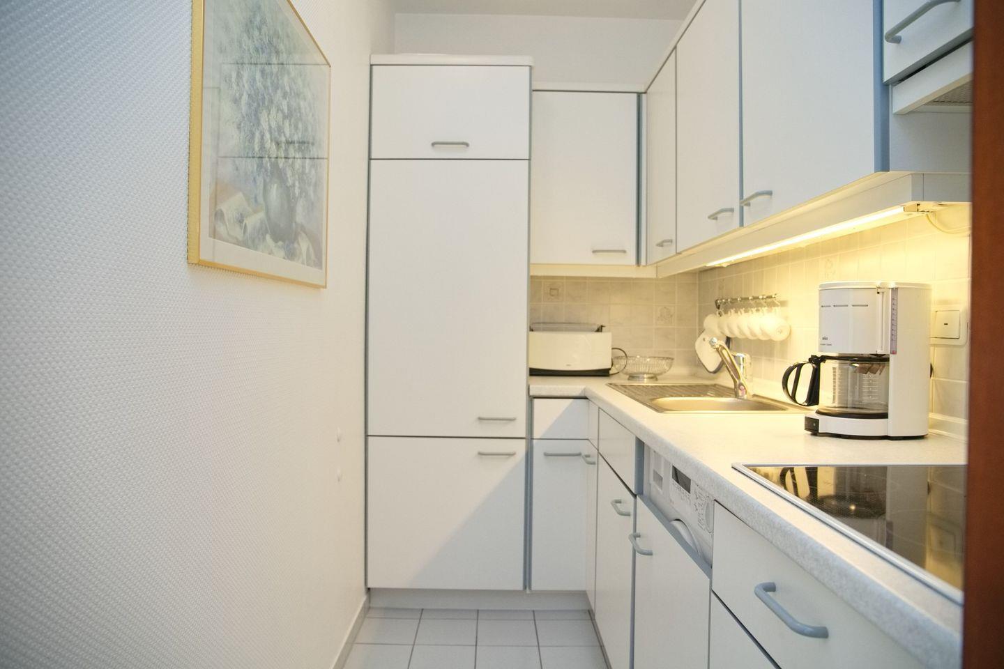 Die Küche ist mit einem Ceranfeld, einem Kühlschrank mit Gefrierfach, einer Geschirrspülmaschine, einer Kaffeemaschine, einem Wasserkocher und einem Toaster ausgestattet, damit Sie sich problemlos selbst verpflegen können.