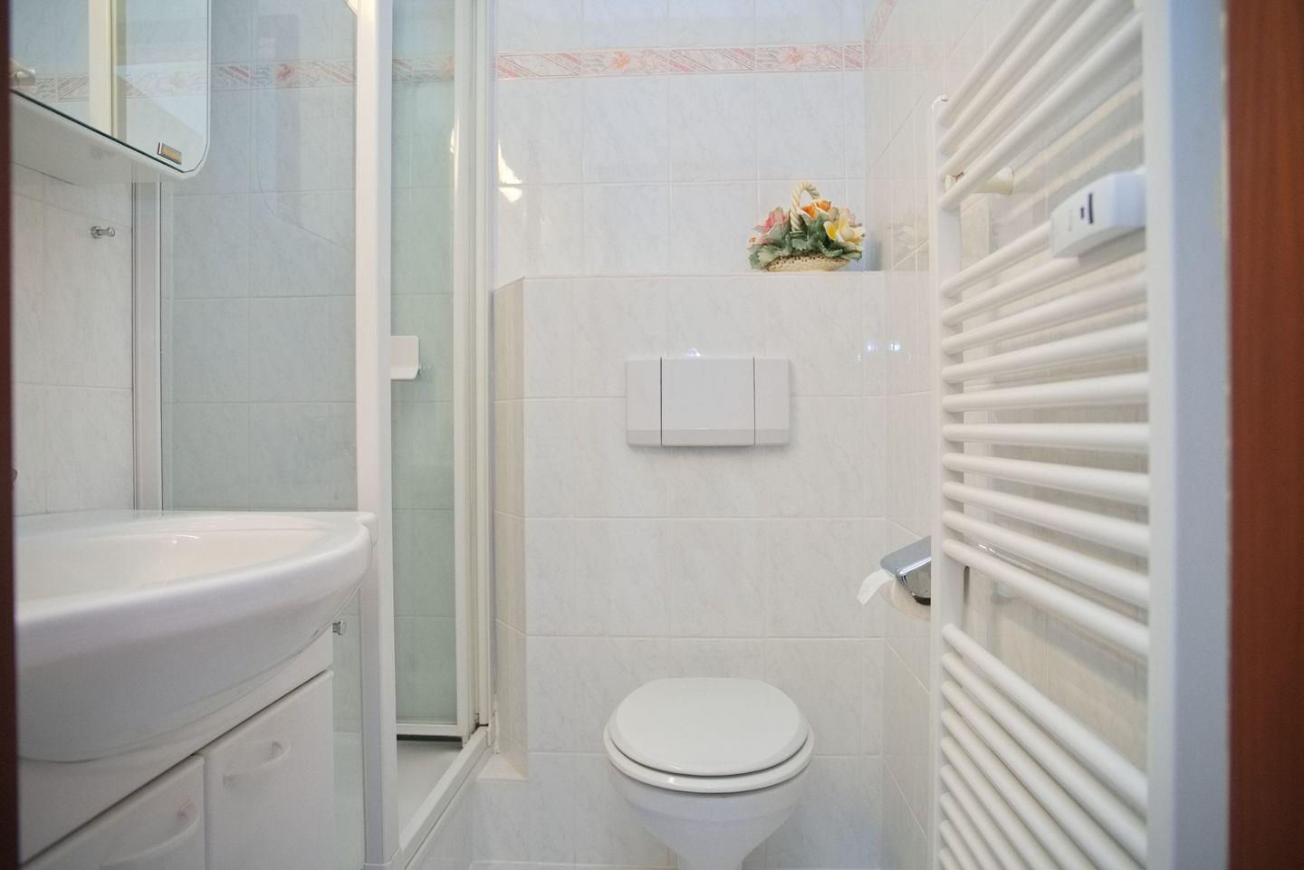 Das Badezimmer ist ein Duschbad mit WC und verfügt über einen Handtuchheizkörper für angenehme Wärme nach dem Duschen.