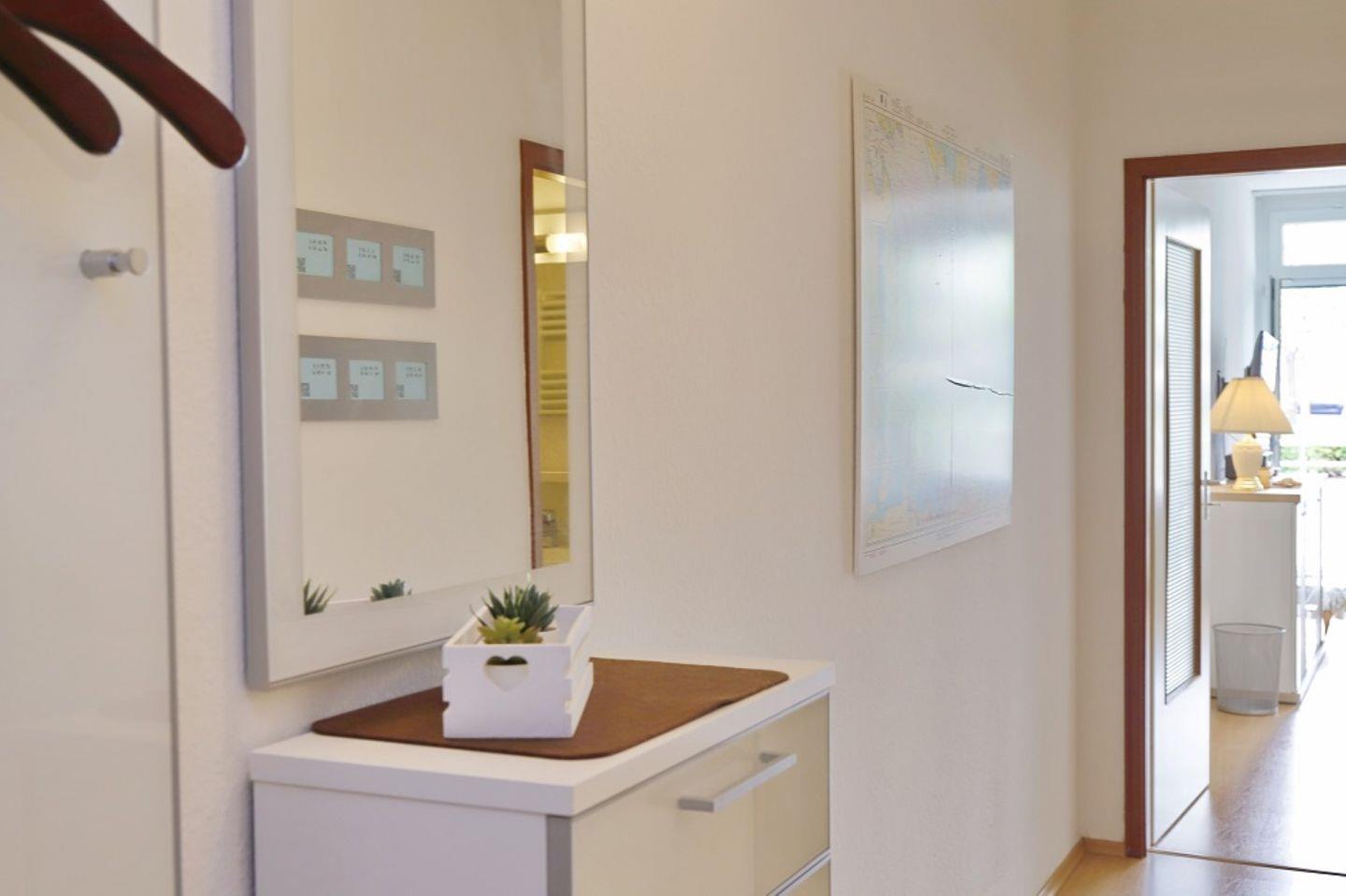 Im Flur verstauen Sie mit Leichtigkeit Ihre Jacken an der Garderobe und können vor dem Ausgehen noch einen Blick in den Spiegel werfen.