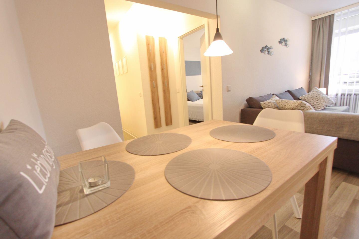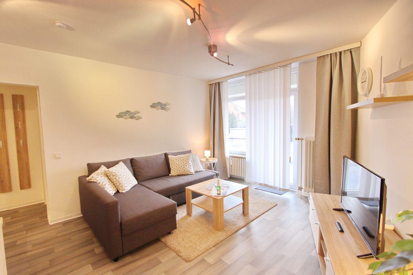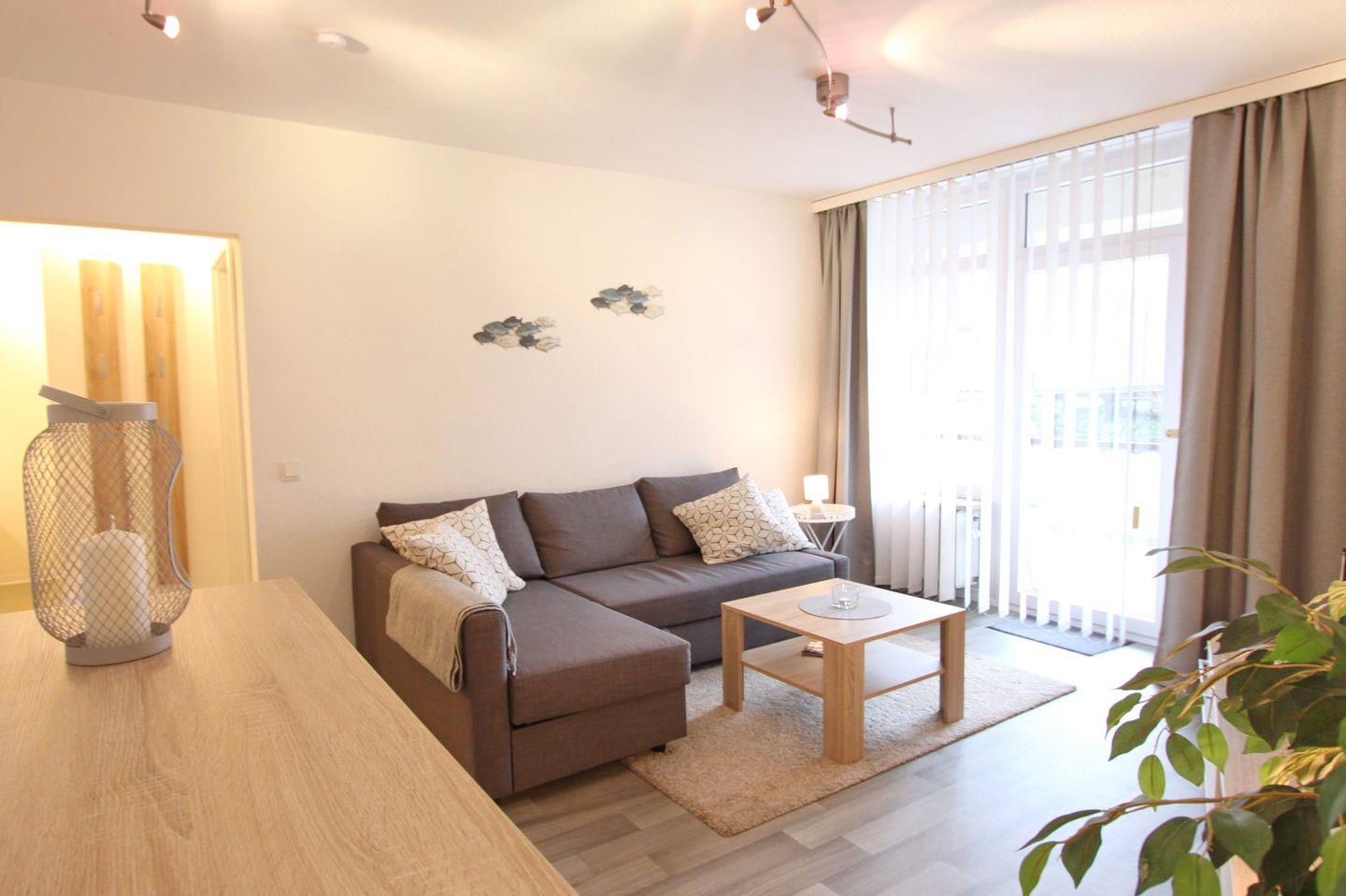 Das Wohnzimmer bietet Ihnen eine gemütliche Schlafcouchgarnitur (140x200 cm) mit Bettkasten, einen Essbereich und den Zugang zum möblierten Nord Balkon. Ein großer Flachbild TV mit Streaming Funktion und ein Radio steht Ihnen zur Unterhaltung bereit.