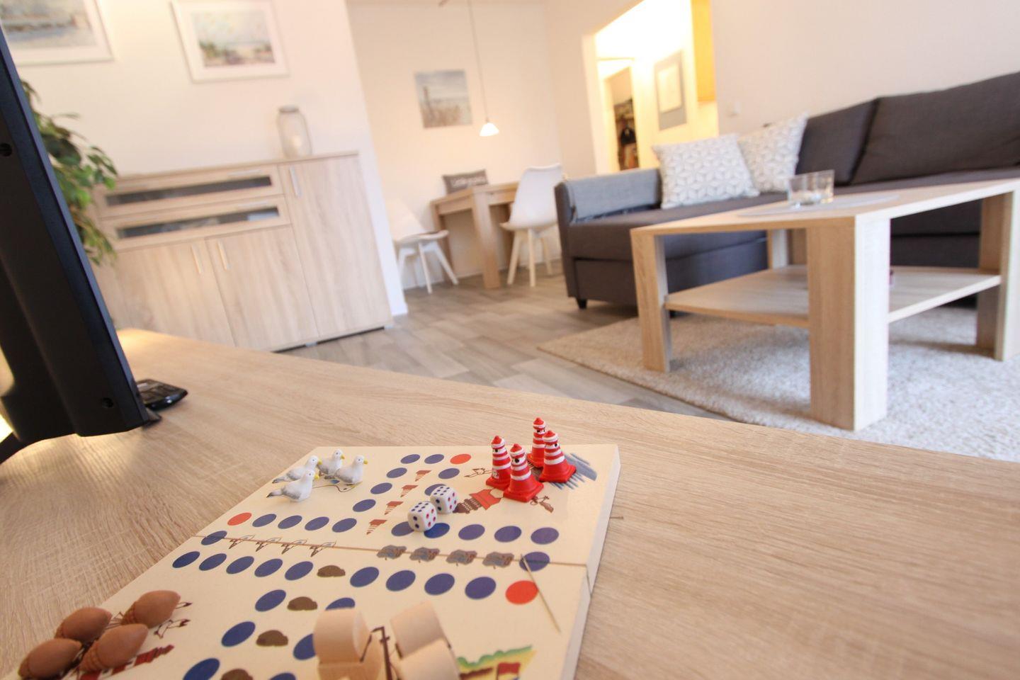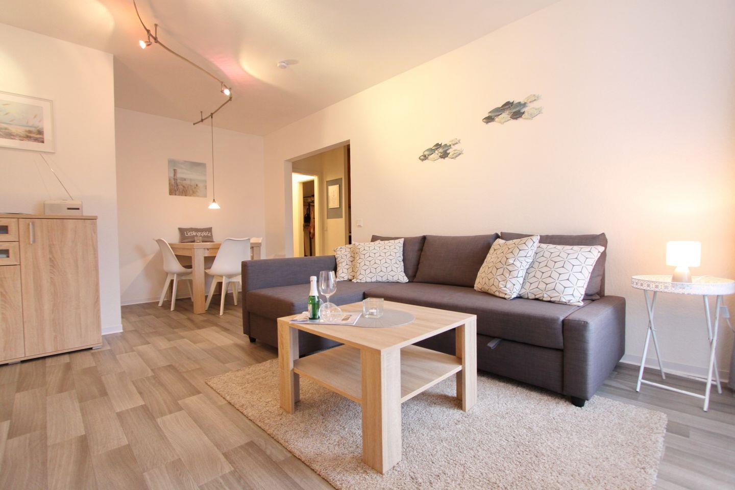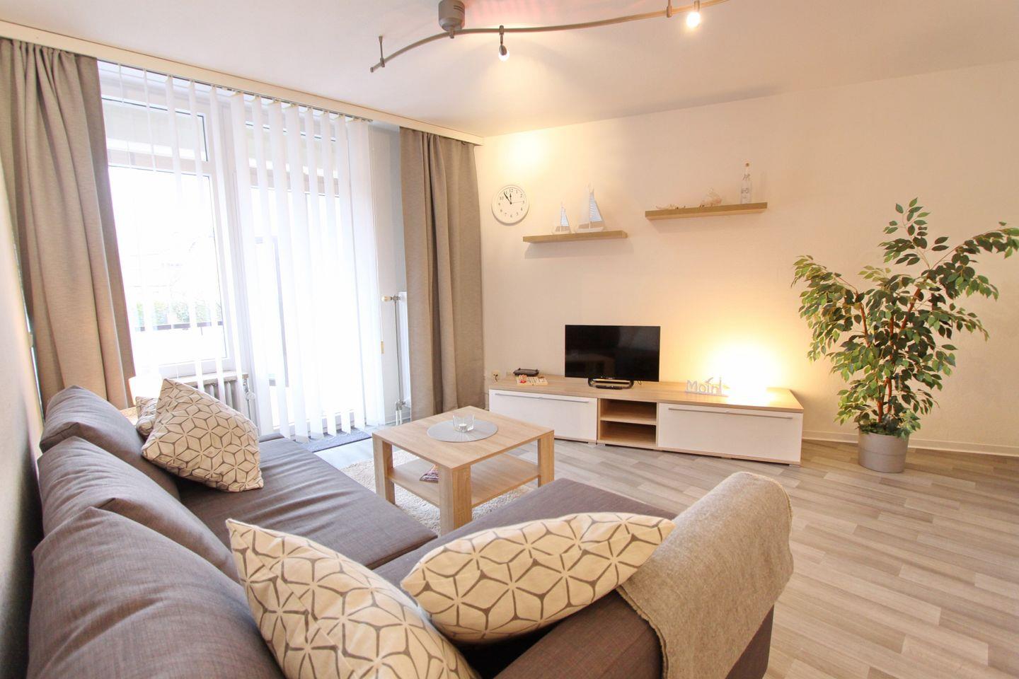 Das Wohnzimmer bietet Ihnen eine gemütliche Schlafcouchgarnitur (140x200 cm) mit Bettkasten, einen Essbereich und den Zugang zum möblierten Nord Balkon. Ein großer Flachbild TV mit Streaming Funktion und ein Radio steht Ihnen zur Unterhaltung bereit.