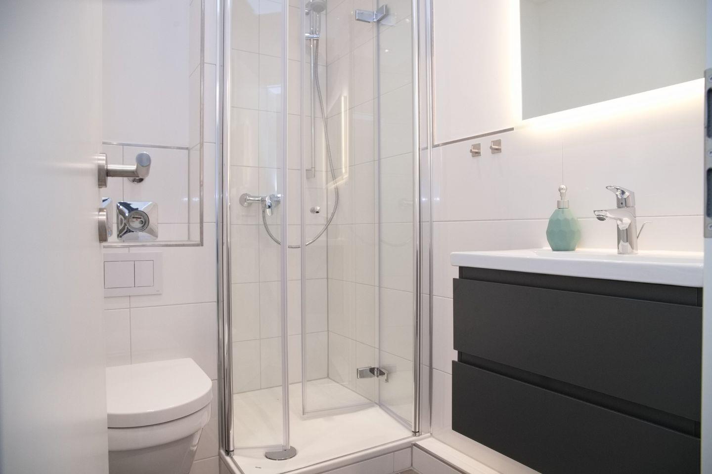 Das Bad mit Dusche, WC und beleuchteten Spiegel komplettiert die Wohnung.