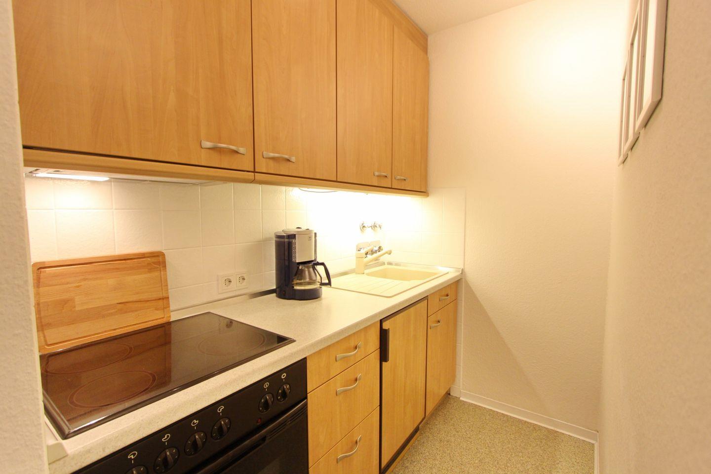 Gegenüber dem Wohnbereich finden Sie die Einbauküche mit Cerankochfeld, Backofen, Kühlschrank mit Gefrierfach, Wasserkocher, Kaffeemaschine und Toaster.