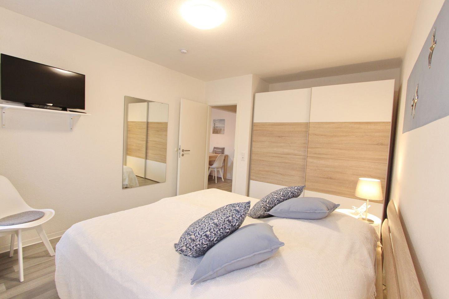 Weiter geht es in das separate Schlafzimmer, ausgestattet mit einem Doppelbett (2x90x200 cm), Flach TV und Kleiderschrank.