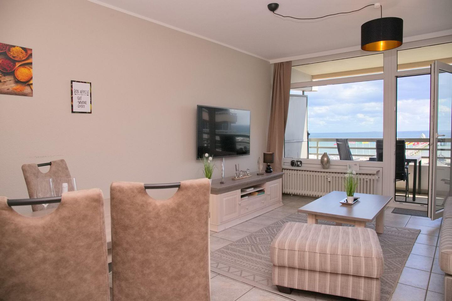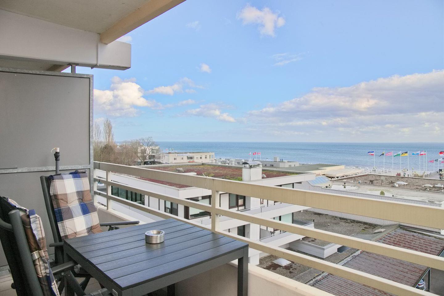 Frisch renovierte 3-Zimmer-Ferienwohnung mit möbliertem Südbalkon und direktem Seeblick an der Seebrücke von Grömitz.