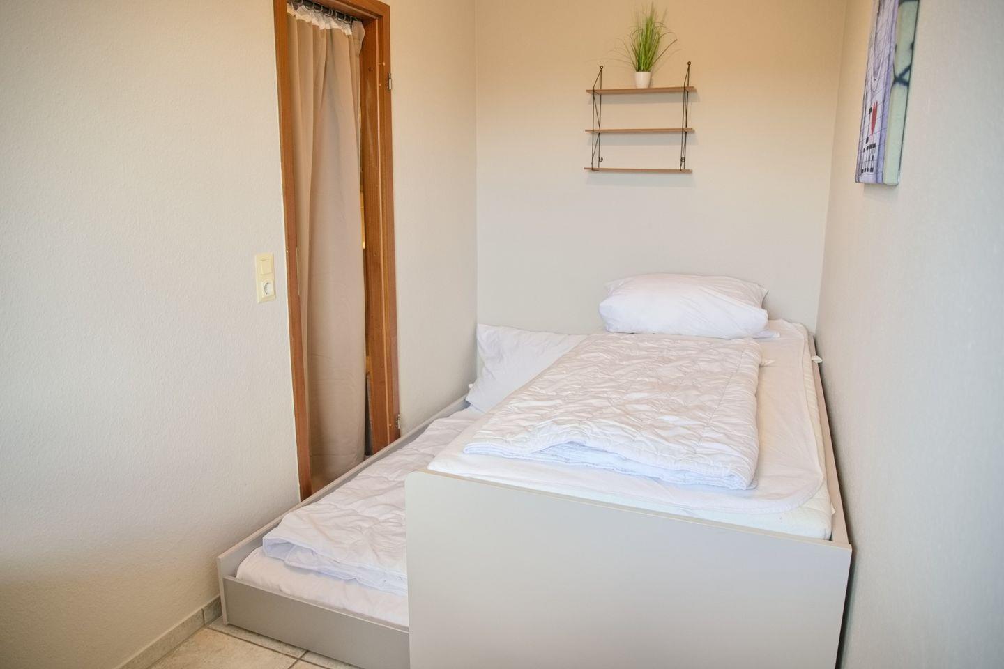 Die zwei Zimmer der Ferienwohnung sind geschmackvoll gestaltet und bieten Ihnen gemütliche Rückzugsorte für erholsame Nächte. Das Hauptschlafzimmer verfügt über ein komfortables Doppelbett (180x200 cm, durchgehender Topper) und für Ihre Urlaubsgarderobe finden Sie ausreichend Platz in dem Kleiderschrank auf dem Flur. Das zweite Zimmer ist eingerichtet mit einem Einzelbett (90x200 cm) und bieten ausreichend Platz für Ihre Familie oder Freunde. Das Einzelbett kann bei Bedarf noch einen weiteren Schlafplatz bieten, dieser ist beengt (70x200 cm).