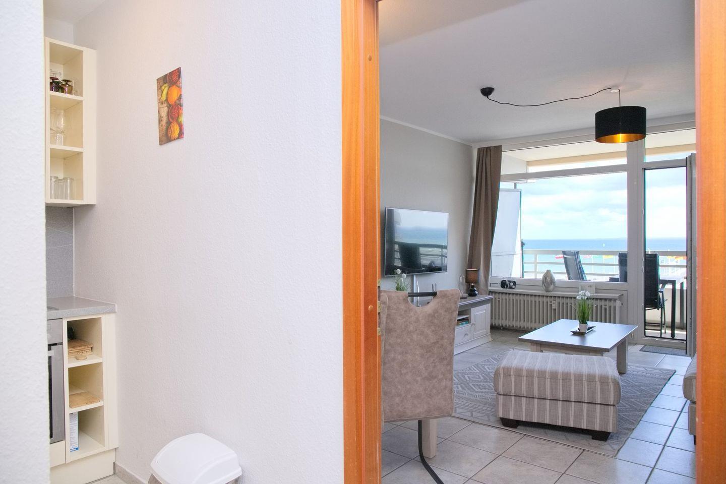 Die separate Küche ist mit modernen Geräten ausgestattet und bietet Ihnen alles, was Sie für die Zubereitung Ihrer Lieblingsmahlzeiten benötigen. Kochen Sie sich ein köstliches Essen und genießen Sie es am Esstisch mit Blick auf die Ostsee oder auf dem möblierten Balkon, wo Sie das beruhigende Rauschen der Wellen und die salzige Meeresluft genießen können.